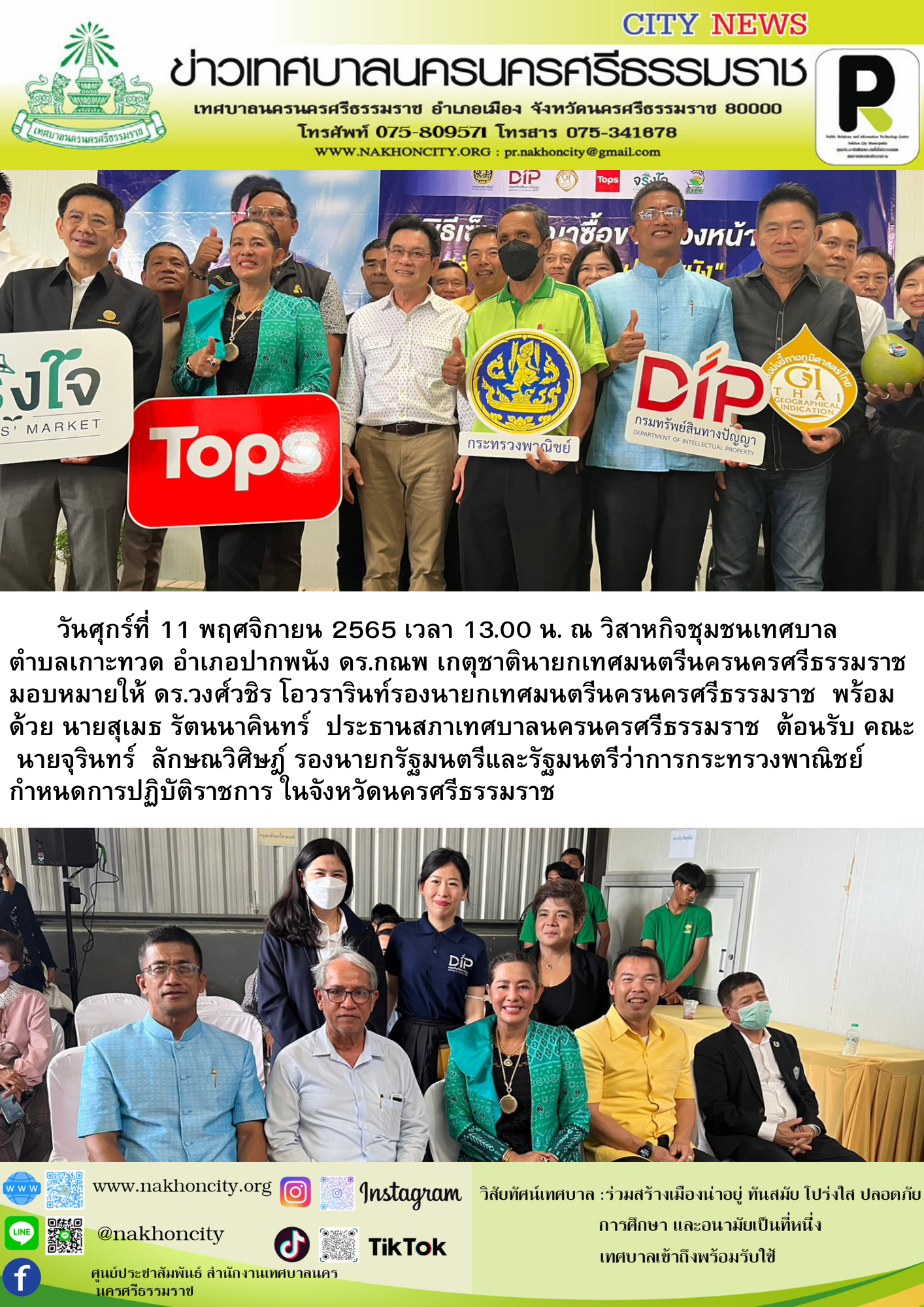 | วันศุกร์ที่ 11 พฤศจิกายน 2565 เวลา 13.00 น. ณ วิสาหกิจชุมชนเทศบาลตำบลเกาะทวด อำเภอปากพนัง ดร.กณพ เกตุชาติ นายกเทศมนตรีนครนครศรีธรรมราช มอบหมายให้ ดร.วงศ์วชิร โอวรารินท์ รองนายกเทศมนตรีนครนครศรีธรรมราช พร้อมด้วย นายสุเมธ รัตนนาคินทร์ ประธานสภาเทศบาลนครนครศรีธรรมราช ต้อนรับ นายจุรินทร์ ลักษณวิศิษฎ์ รองนายกรัฐมนตรีและรัฐมนตรีว่าการกระทรวงพาณิชย์ กำหนดการปฏิบัติราชการ ในจังหวัดนครศรีธรรมราช |