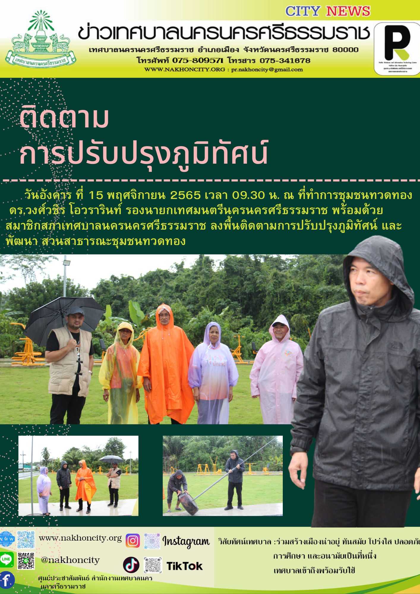 | ดร.วงศ์วชิร โอวรารินท์รองนายกเทศมนตรีนครนครศรีธรรมราช พร้อมด้วย สมาชิกสภาเทศบาลนครนครศรีธรรมราช ลงพื้นติดตามการปรับปรุงภูมิทัศน์ และพัฒนา สวนสาธารณะชุมชนทวดทอง |