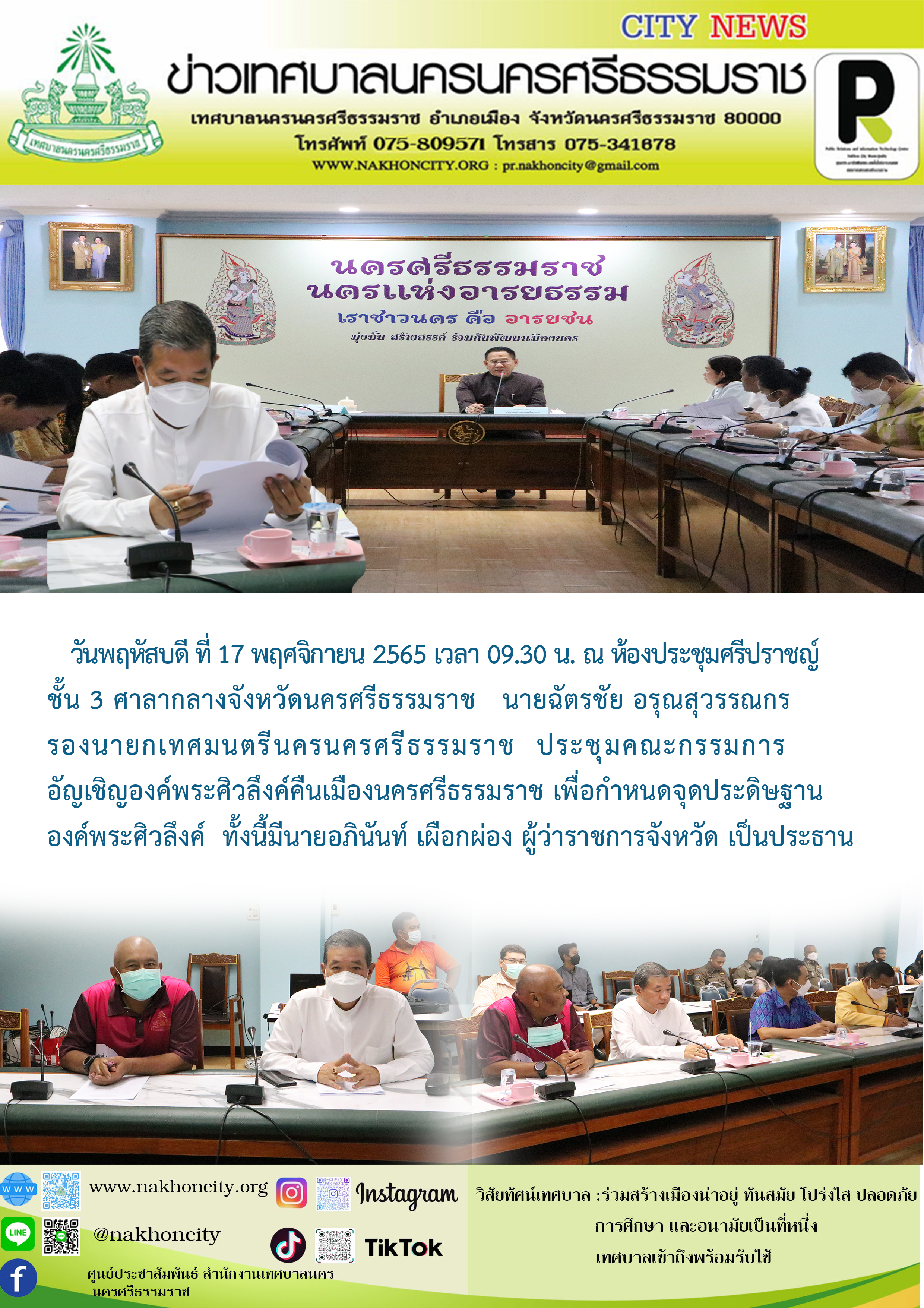 | วันพฤหัสบดี ที่ 17 พฤศจิกายน 2565 เวลา 09.30 น. ณ ห้องประชุมศรีปราชญ์ ชั้น 3 ศาลากลางจังหวัดนครศรีธรรมราช นายฉัตรชัย อรุณสุวรรณกร รองนายกเทศมนตรีนครนครศรีธรรมราช ประชุมคณะกรรมการอัญเชิญองค์พระศิวลึงค์คืนเมืองนครศรีธรรมราช เพื่อกำหนดจุดประดิษฐานองค์พระศิวลึงค์ ทั้งนี้มีนายอภินันท์ เผือกผ่อง ผู้ว่าราชการจังหวัด เป็นประธาน