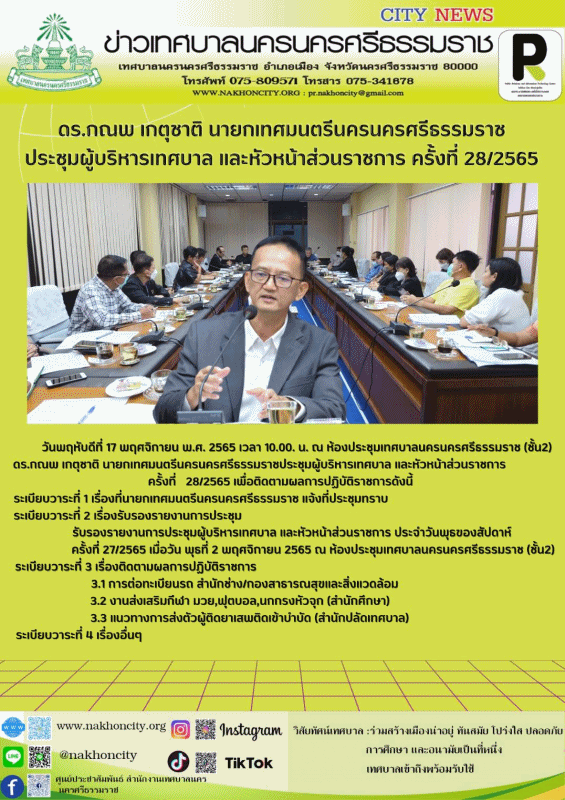 | ดร.กณพ เกตุชาติ นายกเทศมนตรีนครนครศรีธรรมราช ประชุมผู้บริหารเทศบาล และหัวหน้าส่วนราชการ ครั้งที่ 28/2565 |