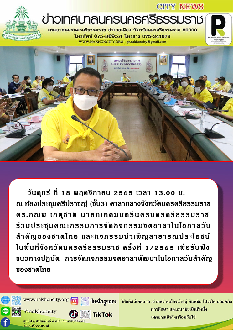 | วันศุกร์ ที่ 18 พฤศจิกายน 2565 เวลา 13.00 น. ณ ห้องประชุมศรีปราชญ์ (ชั้น3) ศาลากลางจังหวัดนครศรีธรรมราช ดร.กณพ เกตุชาติ นายกเทศมนตรีนครนครศรีธรรมราช ร่วมประชุมคณะกรรมการจัดกิจกรรมจิตอาสาในโอกาสวันสำคัญของชาติไทย และกิจกรรมบำเพ็ญสาธารณประโยชน์ ในพื้นที่จังหวัดนครศรีธรรมราช ครั้งที่ 1/2565 เพื่อรับฟัง แนวทางปฎิบัติ การจัดกิจกรรมจิตอาสาพัฒนาในโอกาสวันสำคัญของชาติไทย