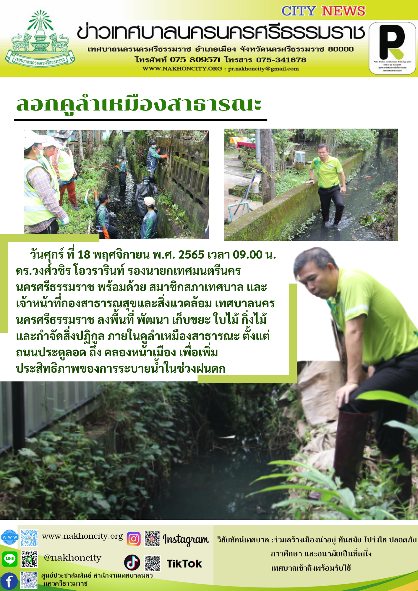 | วันศุกร์ ที่ 18 พฤศจิกายน พ.ศ. 2565 เวลา 09.00 น. ดร.วงศ์วชิร โอวรารินท์ รองนายกเทศมนตรีนครนครศรีธรรมราช พร้อมด้วย สมาชิกสภาเทศบาล และเจ้าหน้าที่กองสาธารณสุขและสิ่งแวดล้อม เทศบาลนครนครศรีธรรมราช ลงพื้นที่ พัฒนา เก็บขยะ ใบไม้ กิ่งไม้ และกำจัดสิ่งปฏิกูล ภายในคูลำเหมืองสาธารณะ ตั้งแต่ถนนประตูลอด ถึง คลองหน้าเมือง เพื่อเพิ่มประสิทธิภาพของการระบายน้ำในช่วงฝนตก |