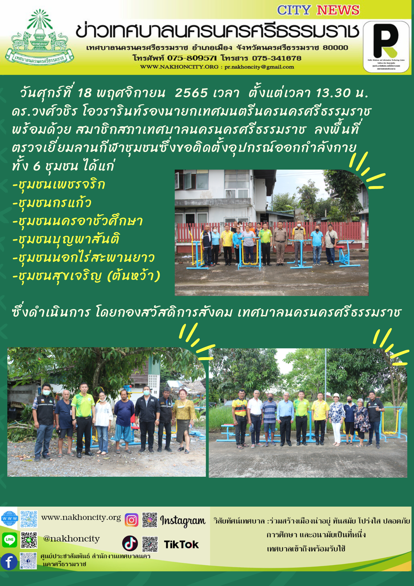 | วันศุกร์ที่ 18 พฤศจิกายน พ.ศ. 2565 เวลา ตั้งแต่เวลา 13.30 น. ดร.วงศ์วชิร โอวรารินท์ รองนายกเทศมนตรีนครนครศรีธรรมราช พร้อมด้วย สมาชิกสภาเทศบาลนครนครศรีธรรมราช ลงพื้นที่ ตรวจเยี่ยมลานกีฬาชุมชนซึ่งขอติดตั้งอุปกรณ์ออกกำลังกายทั้ง 6 ชุมชน ได้แก่