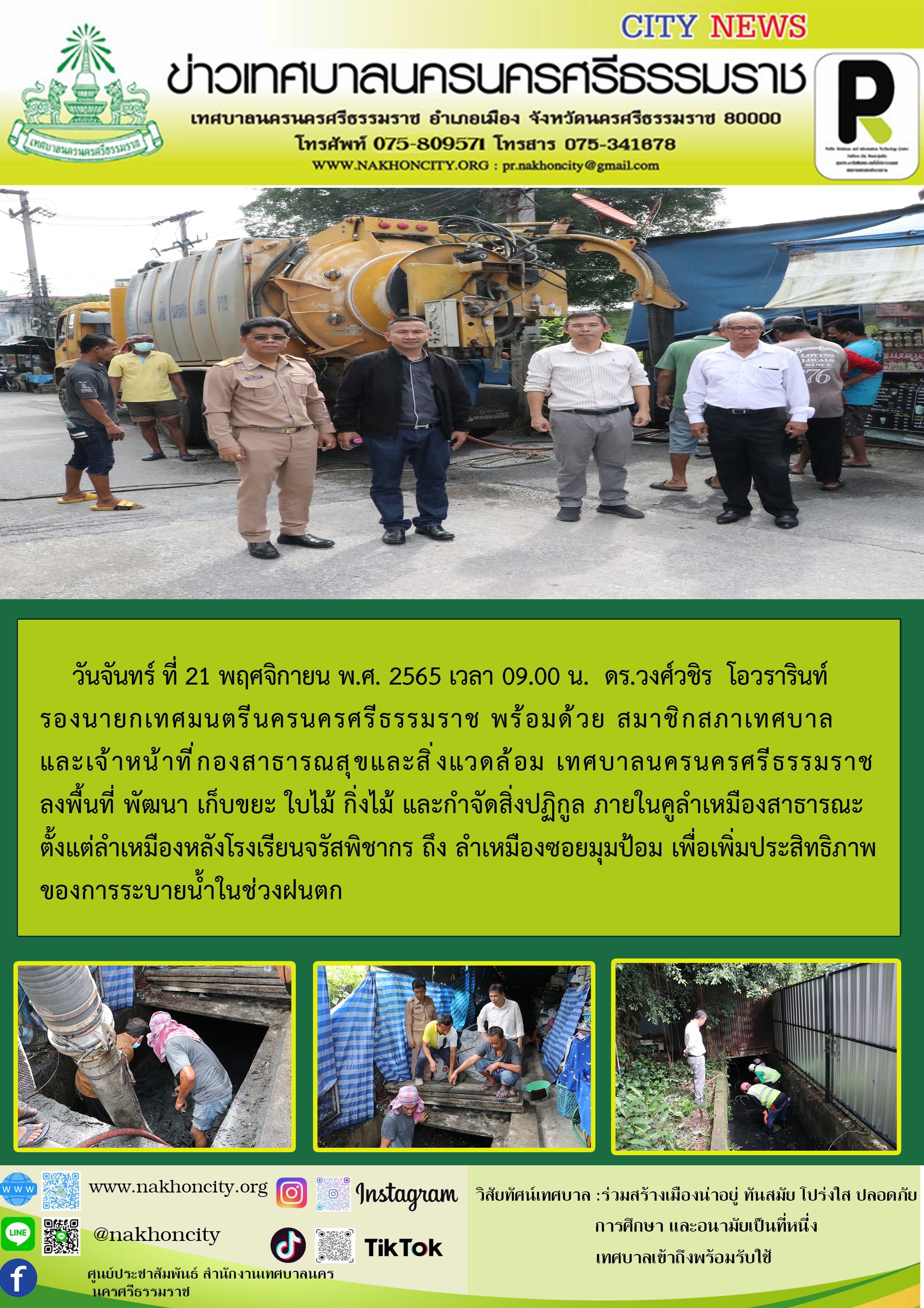 | วันจันทร์ ที่ 21 พฤศจิกายน พ.ศ. 2565 เวลา 09.00 น. ดร.วงศ์วชิร โอวรารินท์ รองนายกเทศมนตรีนครนครศรีธรรมราช พร้อมด้วย สมาชิกสภาเทศบาล และเจ้าหน้าที่กองสาธารณสุขและสิ่งแวดล้อม เทศบาลนครนครศรีธรรมราช ลงพื้นที่ พัฒนา เก็บขยะ ใบไม้ กิ่งไม้ และกำจัดสิ่งปฏิกูล ภายในคูลำเหมืองสาธารณะ ตั้งแต่ลำเหมืองหลังโรงเรียนจรัสพิชากร ถึง ลำเหมืองซอยมุมป้อม เพื่อเพิ่มประสิทธิภาพของการระบายน้ำในช่วงฝนตก
