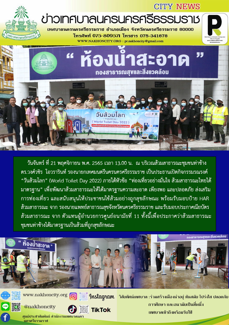 | วันจันทร์ ที่ 21 พฤศจิกายน พ.ศ. 2565 เวลา 13.00 น. ณ บริเวณส้วมสาธารณะชุมชนท่าช้าง ดร.วงศ์วชิร โอวรารินท์ รองนายกเทศมนตรีนครนครศรีธรรมราช เป็นประธานเปิดกิจกรรมรณรงค์ “วันส้วมโลก” (World Toilet Day 2022) ภายใต้หัวข้อ “ท่องเที่ยวอย่างมั่นใจ ส้วมสาธารณะไทยได้มาตรฐาน” เพื่อพัฒนาส้วมสาธารณะให้ได้มาตรฐานความสะอาด เพียงพอ และปลอดภัย ส่งเสริมการท่องเที่ยว และสนับสนุนให้ประชาชนใช้ส้วมอย่างถูกสุขลักษณะ พร้อมรับมอบป้าย HAR ส้วมสาธารณะ จาก รองนายแพทย์สาธารณสุขจังหวัดนครศรีธรรมราช และรับมอบประกาศณียบัตร ส้วมสาธารณะ จาก ตัวแทนผู้อำนวยการศูนย์อนามัยที่ 11 ทั้งนี้เพื่อประกาศว่าส้วมสาธารณะชุมชนท่าช้างได้มาตรฐานเป็นส้วมที่ถูกสุขลักษณะ
