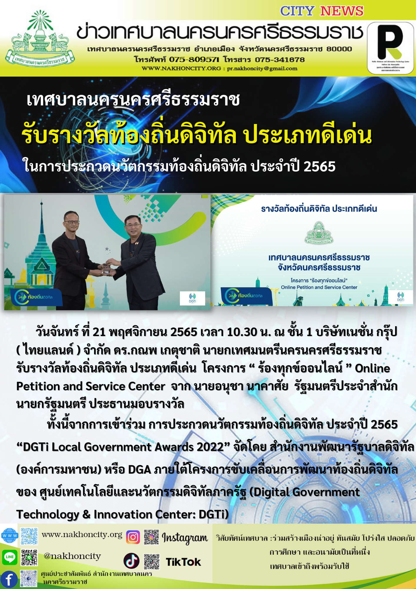 | วันจันทร์ ที่ 21 พฤศจิกายน 2565 เวลา 10.30 น. ณ ชั้น 1 บริษัทเนชั่น กรุ๊ป ( ไทยแลนด์ ) จำกัด ดร.กณพ เกตุชาติ นายกเทศมนตรีนครนครศรีธรรมราช รับรางวัลท้องถิ่นดิจิทัล ประเภทดีเด่น โครงการ “ ร้องทุกข์ออนไลน์ ” Online Petition and Service Center จาก นายอนุชา นาคาศัย รัฐมนตรีประจำสำนักนายกรัฐมนตรี ประธานมอบรางวัล ทั้งนี้จากการเข้าร่วม การประกวดนวัตกรรมท้องถิ่นดิจิทัล ประจำปี 2565 “DGTi Local Government Awards 2022” จัดโดย สำนักงานพัฒนารัฐบาลดิจิทัล (องค์การมหาชน) หรือ DGA ภายใต้โครงการขับเคลื่อนการพัฒนาท้องถิ่นดิจิทัล ของ ศูนย์เทคโนโลยีและนวัตกรรมดิจิทัลภาครัฐ (Digital Government Technology & Innovation Center: DGTi)