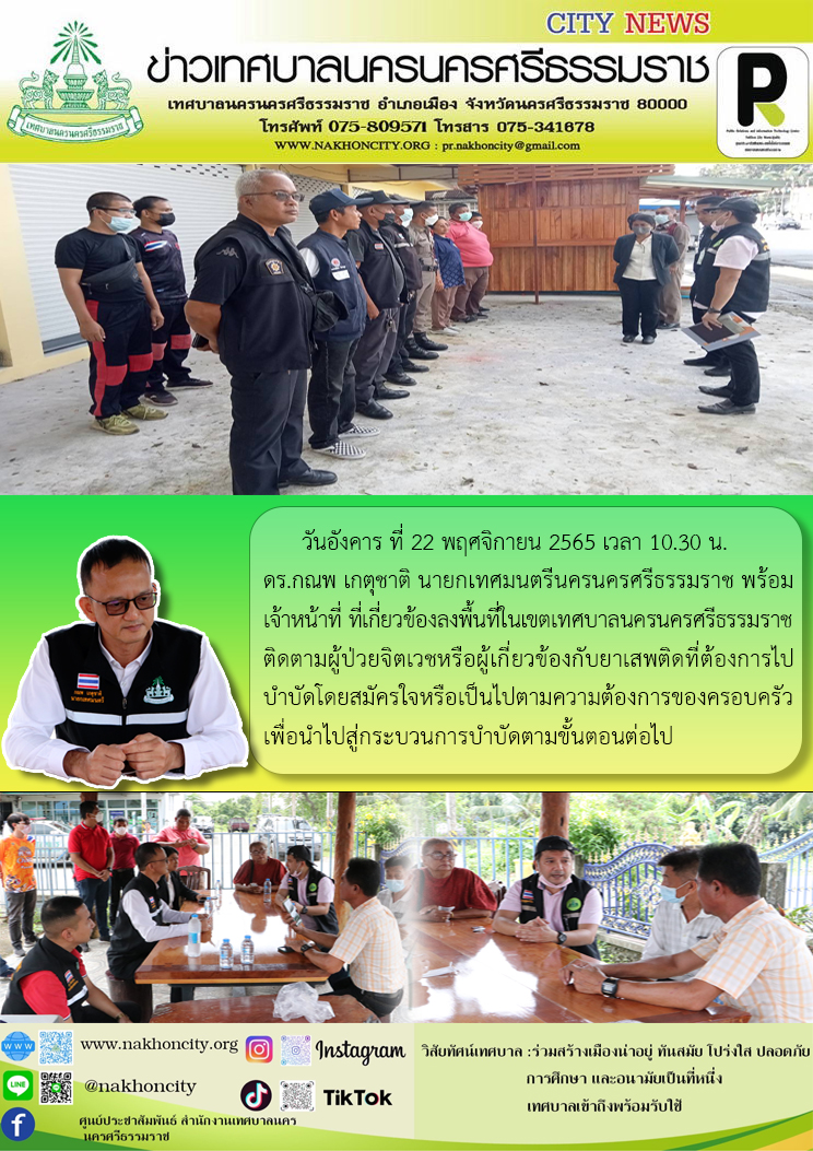| วันอังคาร ที่ 22 พฤศจิกายน 2565 เวลา 10.30 น. ดร.กณพ เกตุชาติ นายกเทศมนตรีนครนครศรีธรรมราช พร้อมเจ้าหน้าที่ ที่เกี่ยวข้อง ลงพื้นที่ในเขตเทศบาลนครนครศรีธรรมราช ติดตามผู้ป่วยจิตเวชหรือผู้เกี่ยวข้องกับยาเสพติดที่ต้องการไปบำบัดโดยสมัครใจหรือเป็นไปตามความต้องการของครอบครัว เพื่อนำไปสู่กระบวนการบำบัดตามขั้นตอนต่อไป