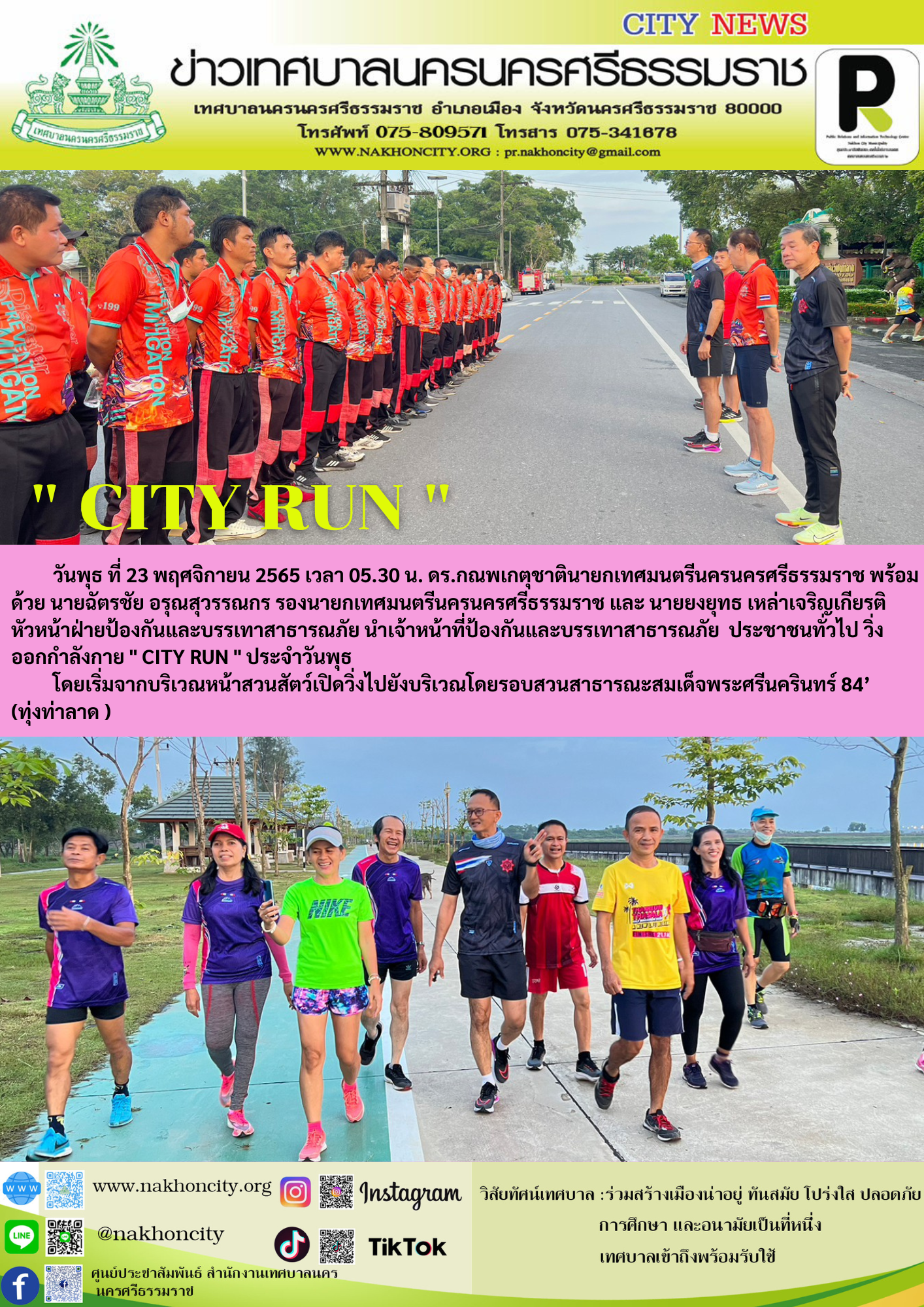 | ดร.กณพ เกตุชาติ นายกเทศมนตรีนครนครศรีธรรมราช นำเจ้าหน้าที่ป้องกันและบรรเทาสาธารณภัย เทศบาลนครนครศรีธรรมราช ประชาชนทั่วไป วิ่งออกกำลังกาย " CITY RUN " ประจำวันพุธ ที่ 23 พฤศจิกายน 2565 |