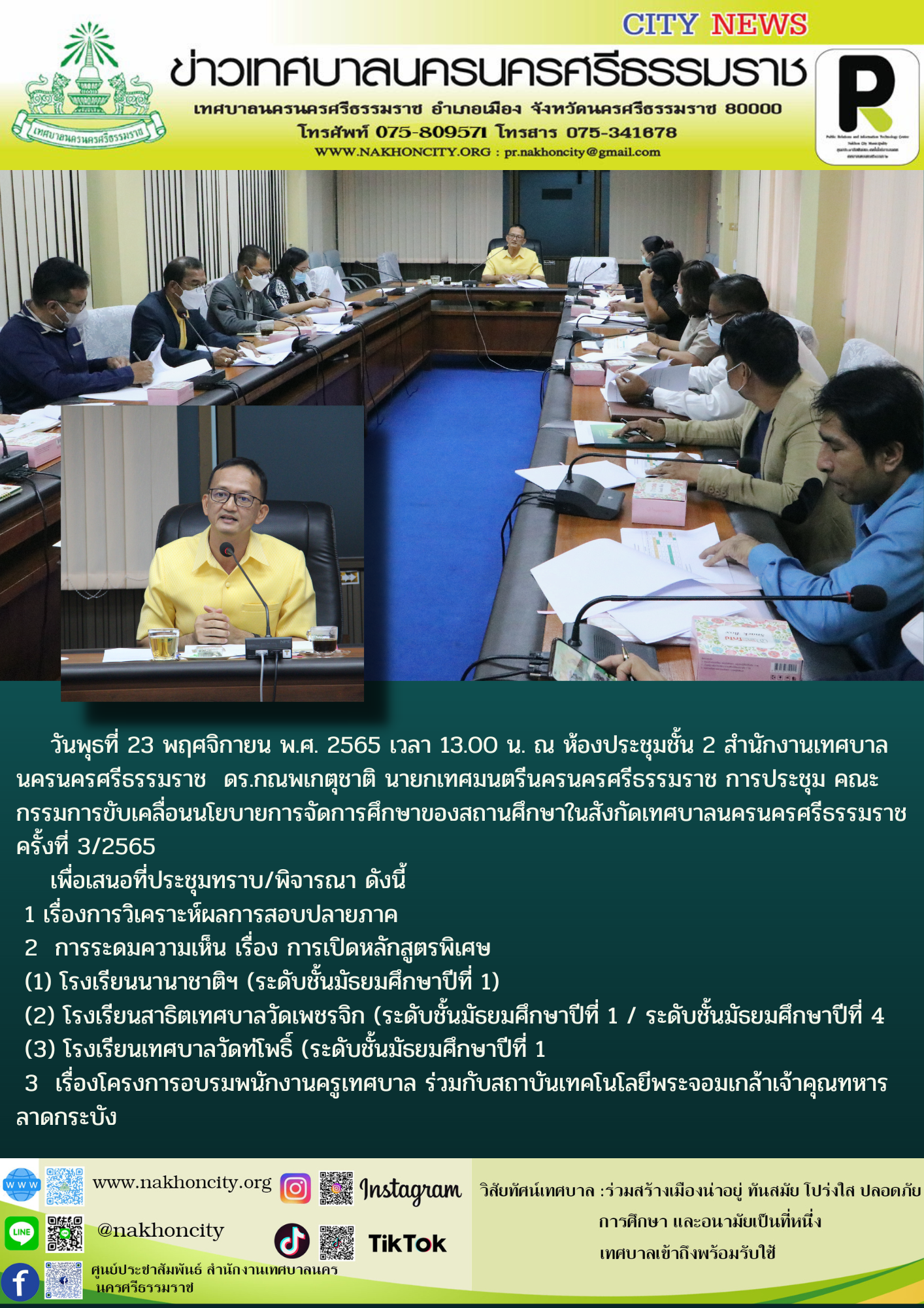 | วันพุธที่ 23 พฤศจิกายน พ.ศ. 2565 เวลา 13.00 น. ณ ห้องประชุมชั้น 2 สำนักงานเทศบาลนครนครศรีธรรมราช ดร.กณพ เกตุชาติ นายกเทศมนตรีนครนครศรีธรรมราช การประชุม คณะกรรมการขับเคลื่อนนโยบายการจัดการศึกษาของสถานศึกษาในสังกัดเทศบาลนครนครศรีธรรมราช ครั้งที่ 3/2565 เพื่อเสนอที่ประชุมทราบ/พิจารณา ดังนี้ 1 เรื่องการวิเคราะห์ผลการสอบปลายภาค 2 การระดมความเห็น เรื่อง การเปิดหลักสูตรพิเศษ (1) โรงเรียนนานาชาติฯ (ระดับชั้นมัธยมศึกษาปีที่ 1) (2) โรงเรียนสาธิตเทศบาลวัดเพชรจิก (ระดับชั้นมัธยมศึกษาปีที่ 1 / ระดับชั้นมัธยมศึกษาปีที่ 4 (3) โรงเรียนเทศบาลวัดท่โพธิ์ (ระดับชั้นมัธยมศึกษาปีที่ 1 3 เรื่องโครงการอบรมพนักงานครูเทศบาล ร่วมกับสถาบันเทคโนโลยีพระจอมเกล้าเจ้าคุณทหารลาดกระบัง |