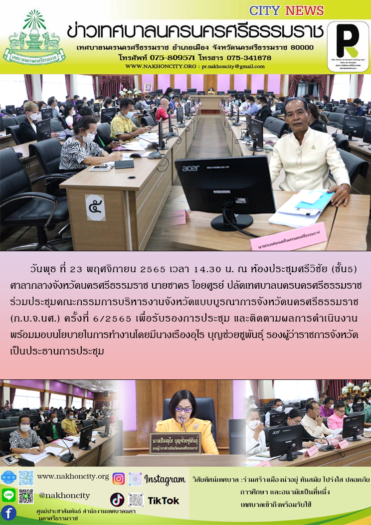 | ปลัดเทศบาลนครนครศรีธรรมราช ร่วมประชุมคณะกรรมการบริหารงานจังหวัดแบบบูรณาการจังหวัดนครศรีธรรมราช (ก.บ.จ.นศ.) ครั้งที่ 6/2565 |