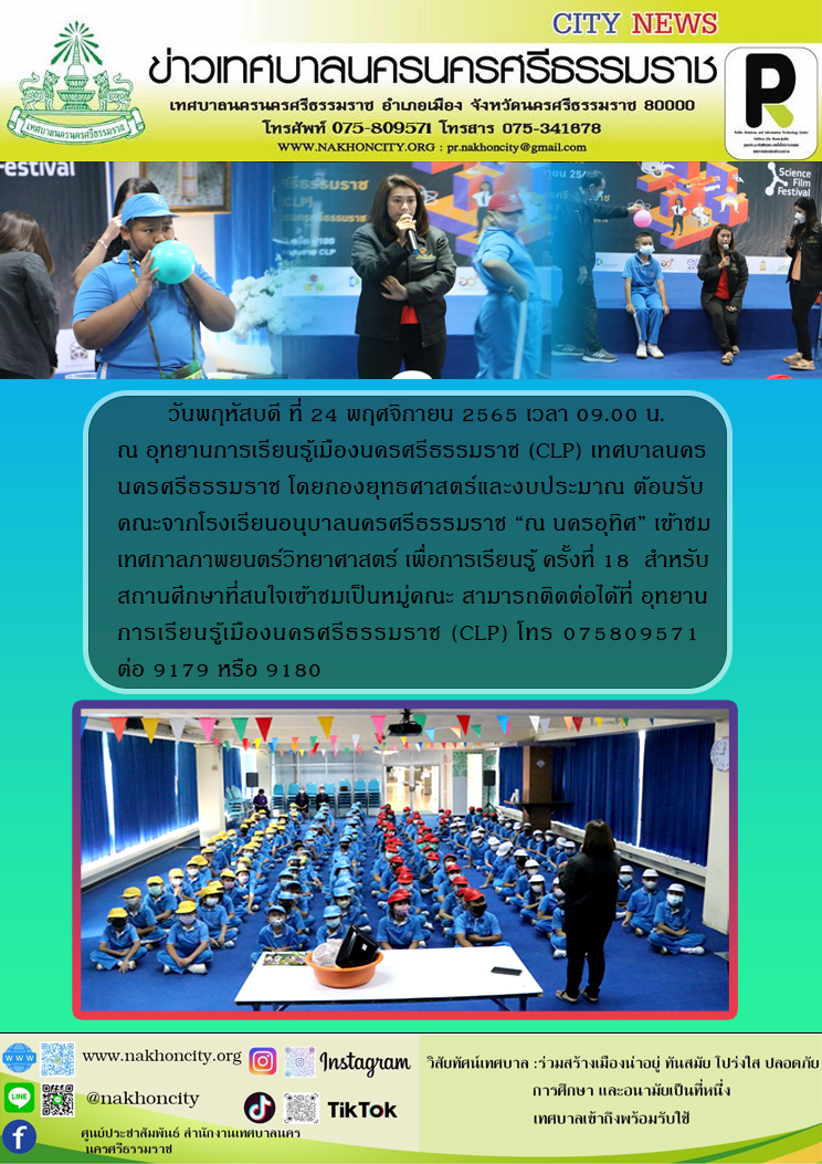 | วันพฤหัสบดี ที่ 24 พฤศจิกายน 2565 เวลา 09.00 น. ณ อุทยานการเรียนรู้เมืองนครศรีธรรมราช (CLP) เทศบาลนครนครศรีธรรมราช โดยกองยุทธศาสตร์และงบประมาณ ต้อนรับคณะจากโรงเรียนอนุบาลนครศรีธรรมราช “ณ นครอุทิศ” เข้าชมเทศกาลภาพยนตร์วิทยาศาสตร์ เพื่อการเรียนรู้ ครั้งที่ 18 สำหรับสถานศึกษาที่สนใจเข้าชมเป็นหมู่คณะ สามารถติดต่อได้ที่ อุทยานการเรียนรู้เมืองนครศรีธรรมราช (CLP) โทร 075809571 ต่อ 9179 หรือ 9180