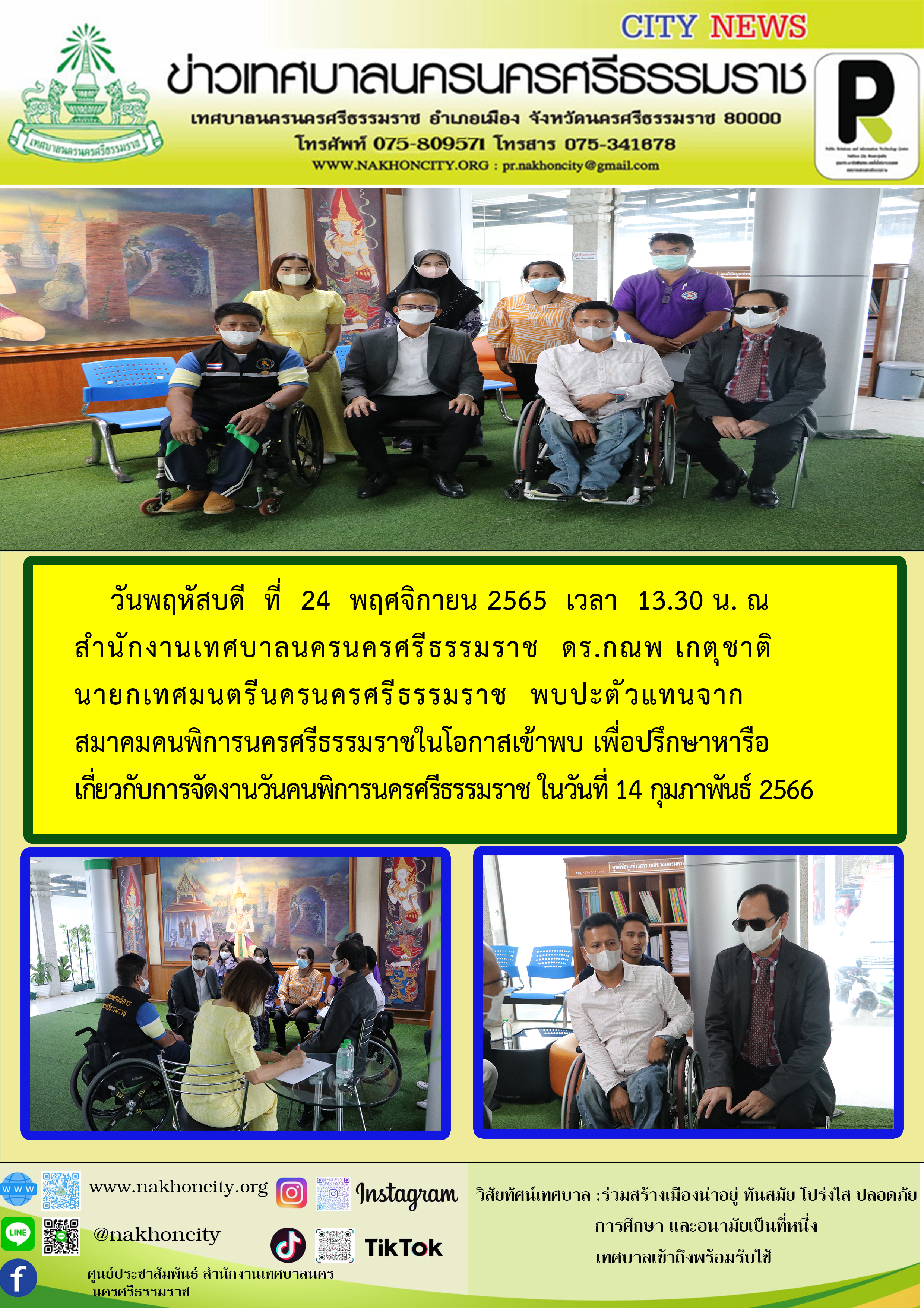 | วันพฤหัสบดี ที่ 24 พฤศจิกายน 2565 เวลา 13.30 น. ณ สำนักงานเทศบาลนครนครศรีธรรมราช ดร.กณพ เกตุชาติ นายกเทศมนตรีนครนครศรีธรรมราช พบปะตัวแทนจากสมาคมคนพิการนครศรีธรรมราช ในโอกาสเข้าพบ เพื่อปรึกษาหารือเกี่ยวกับการจัดงานวันคนพิการนครศรีธรรมราช ในวันที่ 14 กุมภาพันธ์ 2566