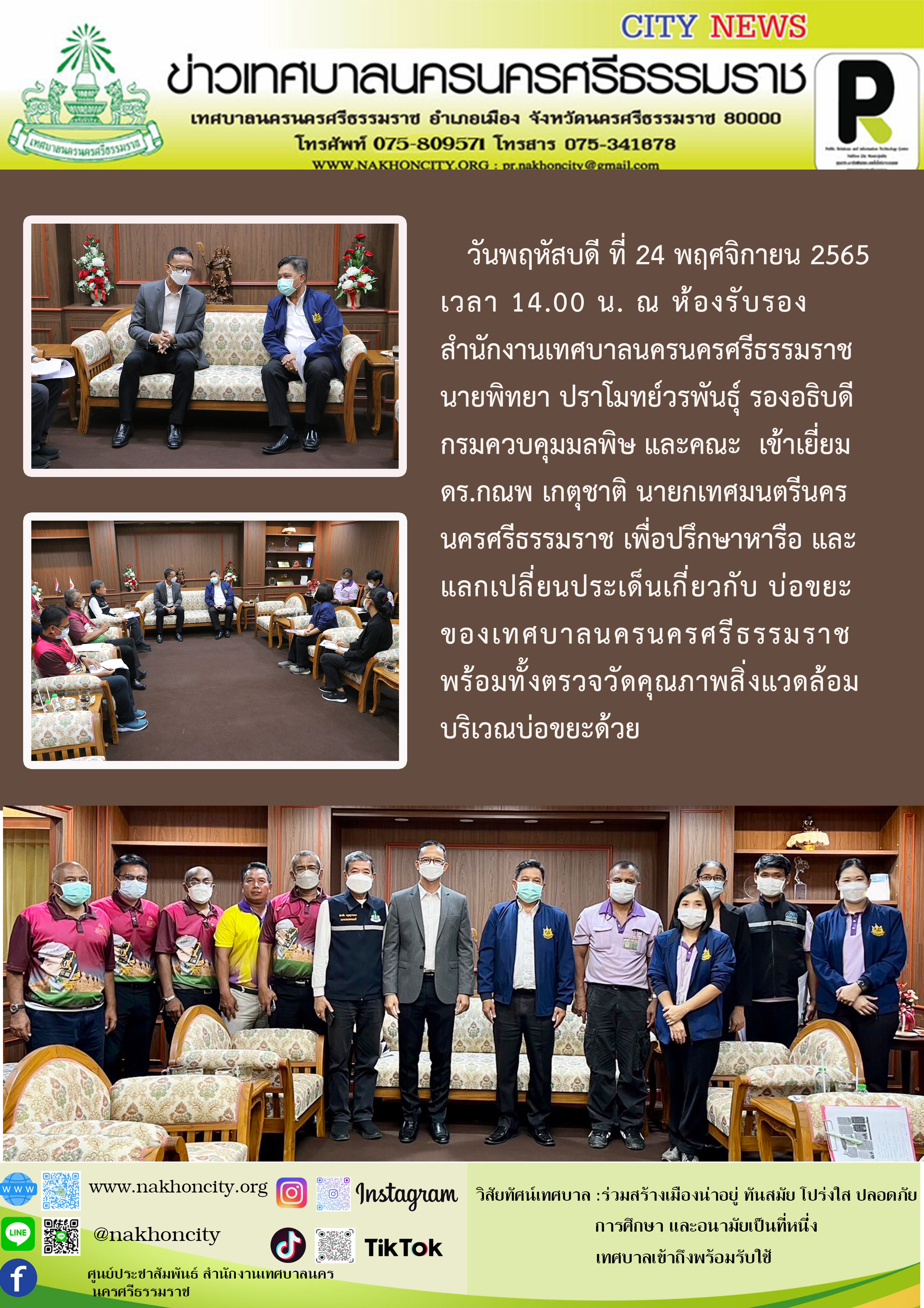 | วันพฤหัสบดี ที่ 24 พฤศจิกายน 2565 เวลา 14.00 น. ณ ห้องรับรอง สำนักงานเทศบาลนคร นครศรีธรรมราช นายพิทยา ปราโมทย์วรพันธุ์ รองอธิบดีกรมควบคุมมลพิษ และคณะ เข้าเยี่ยม ดร.กณพ เกตุชาติ นายกเทศมนตรีนครนครศรีธรรมราช เพื่อปรึกษาหารือ และแลกเปลี่ยนประเด็นเกี่ยวกับบ่อขยะของเทศบาลนครนครศรีธรรมราช พร้อมทั้งตรวจวัดคุณภาพสิ่งแวดล้อมบริเวณบ่อขยะด้วย