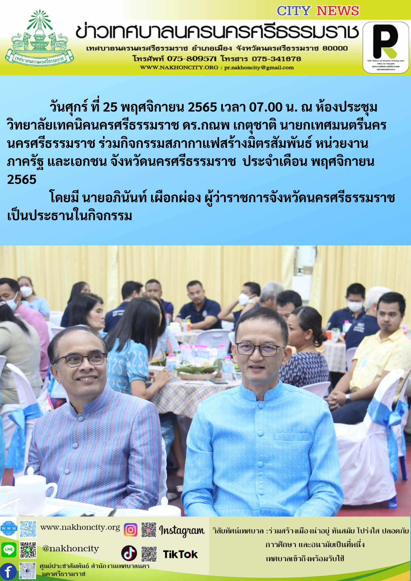 | วันศุกร์ ที่ 25 พฤศจิกายน 2565 เวลา 07.00 น. ณ ห้องประชุมวิทยาลัยเทคนิคนครศรีธรรมราช ดร.กณพ เกตุชาติ นายกเทศมนตรีนครนครศรีธรรมราช ร่วมกิจกรรมสภากาแฟสร้างมิตรสัมพันธ์ หน่วยงานภาครัฐ และเอกชน จังหวัดนครศรีธรรมราช ประจำเดือน พฤศจิกายน 2565 โดยมี นายอภินันท์ เผือกผ่อง ผู้ว่าราชการจังหวัดนครศรีธรรมราช เป็นประธานในกิจกรรม