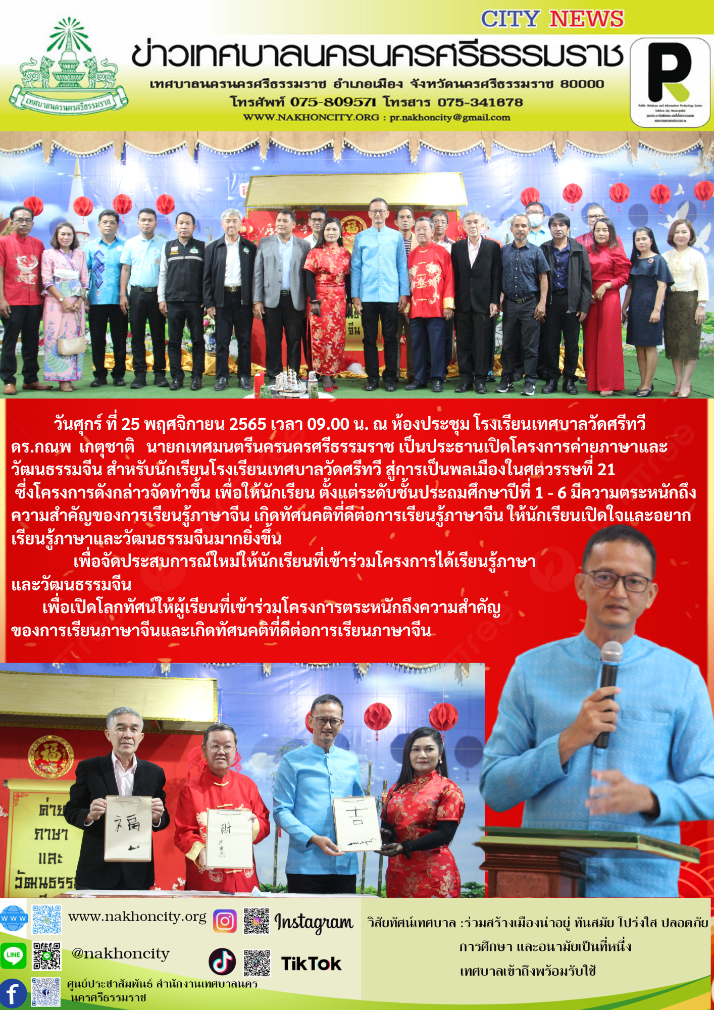 | วันศุกร์ ที่ 25 พฤศจิกายน 2565 เวลา 09.00 น. ณ ห้องประชุม โรงเรียนเทศบาลวัดศรีทวี ดร.กณพ เกตุชาติ นายกเทศมนตรีนครนครศรีธรรมราช เป็นประธานเปิดโครงการค่ายภาษาและวัฒนธรรมจีน สำหรับนักเรียนโรงเรียนเทศบาลวัดศรีทวี สู่การเป็นพลเมืองในศตวรรษที่ 21 ซี่งโครงการดังกล่าวจัดทำขึ้น เพื่อให้นักเรียน ตั้งแต่ระดับชั้นประถมศึกษาปีที่ 1 - 6 มีความตระหนักถึงความสำคัญของการเรียนรู้ภาษาจีน เกิดทัศนคติที่ดีต่อการเรียนรู้ภาษาจีน ให้นักเรียนเปิดใจและอยากเรียนรู้ภาษาและวัฒนธรรมจีนมากยิ่งขึ้น เพื่อจัดประสบการณ์ใหม่ให้นักเรียนที่เข้าร่วมโครงการได้เรียนรู้ภาษาและวัฒนธรรมจีน เพื่อเปิดโลกทัศน์ให้ผู้เรียนที่เข้าร่วมโครงการตระหนักถึงความสำคัญของการเรียนภาษาจีนและเกิดทัศนคติที่ดีต่อการเรียนภาษาจีน