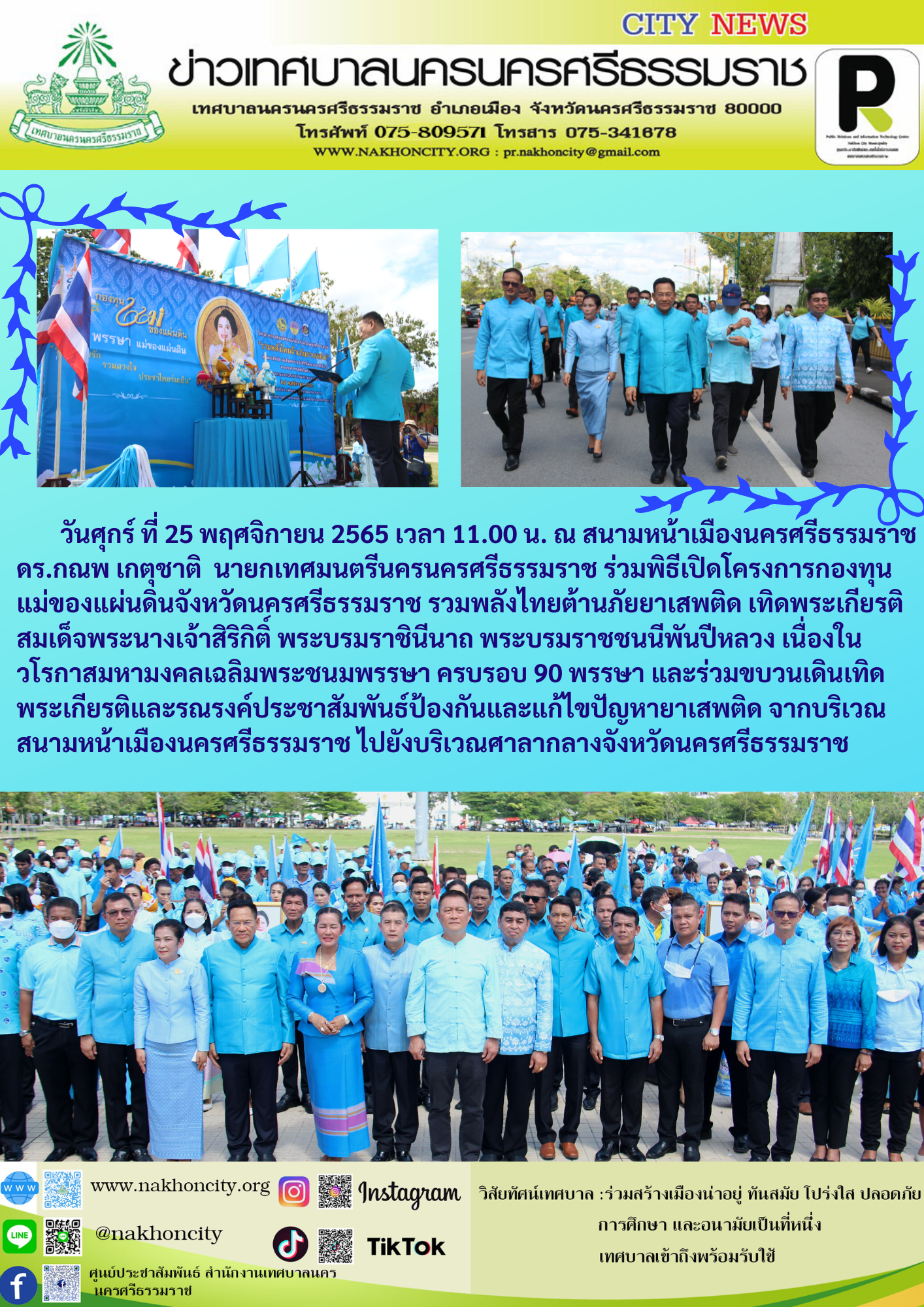 | วันศุกร์ ที่ 25 พฤศจิกายน 2565 เวลา 11.00 น. ณ สนามหน้าเมืองนครศรีธรรมราช ดร.กณพ เกตุชาติ นายกเทศมนตรีนครนครศรีธรรมราช ร่วมพิธีเปิดโครงการกองทุนแม่ของแผ่นดินจังหวัดนครศรีธรรมราช รวมพลังไทยต้านภัยยาเสพติด เทิดพระเกียรติสมเด็จพระนางเจ้าสิริกิติ์ พระบรมราชินีนาถ พระบรมราชชนนีพันปีหลวง เนื่องในวโรกาสมหามงคลเฉลิมพระชนมพรรษา ครบรอบ 90 พรรษา และร่วมขบวนเดินเทิดพระเกียรติและรณรงค์ประชาสัมพันธ์ป้องกันและแก้ไขปัญหายาเสพติด จากบริเวณสนามหน้าเมืองนครศรีธรรมราช ไปยังบริเวณศาลากลางจังหวัดนครศรีธรรมราช