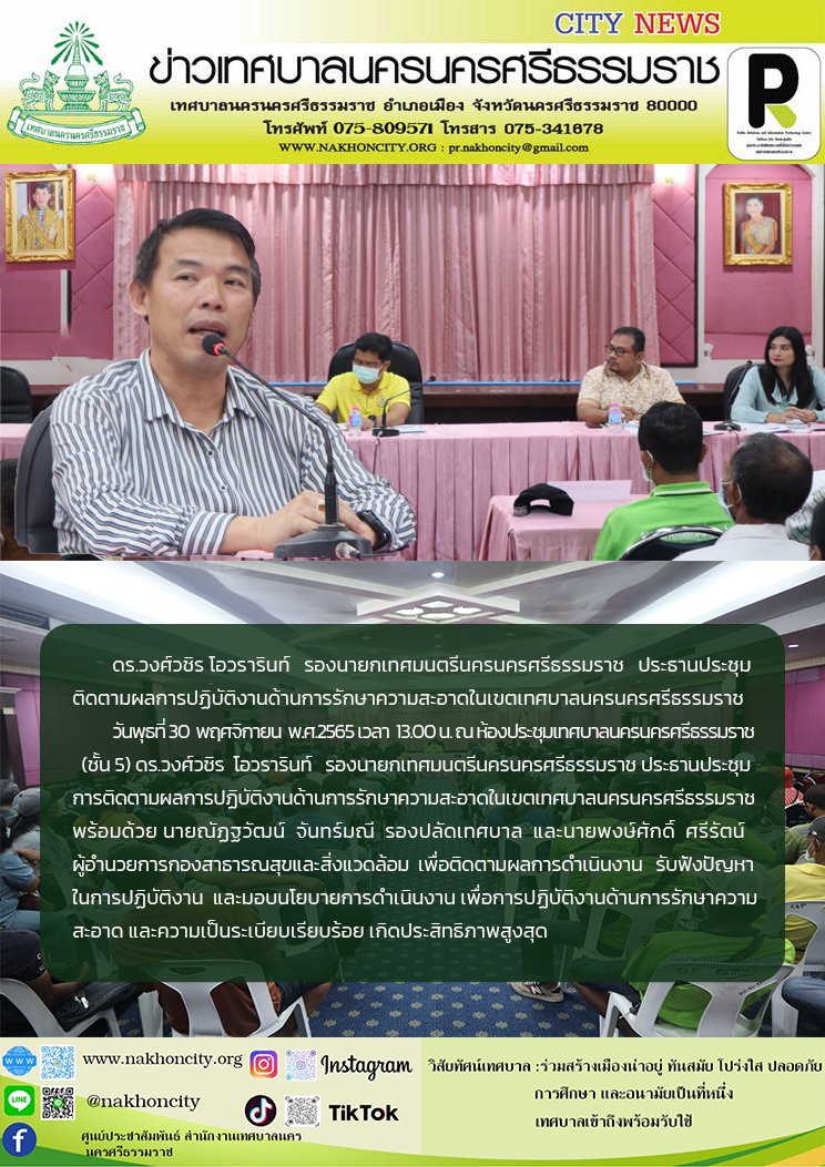| ดร.วงศ์วชิร โอวรารินท์ รองนายกเทศมนตรีนครนครศรีธรรมราช ประธานประชุมติดตามผลการปฏิบัติงานด้านการรักษาความสะอาดในเขตเทศบาลนครนครศรีธรรมราช |