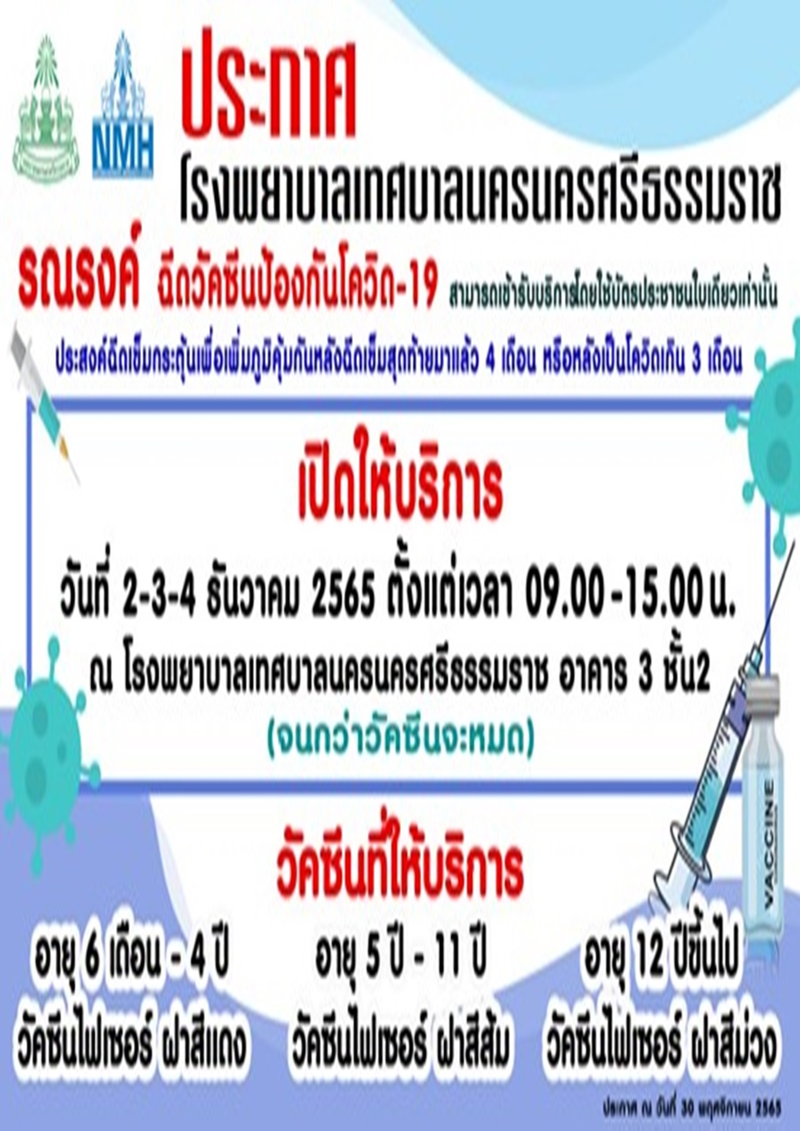 | เทศบาลนครนครศรีธรรมราช ห่วงใยประชาชน รณรงค์ฉีดวัคซีนป้องกันโรคโควิด-19 เข็มกระตุ้น เพิ่มภูมิคุ้มกันหลังฉีดเข็มสุดท้ายมาแล้ว 4 เดือน และเพิ่มความปลอดภัยก่อนปีใหม่ |