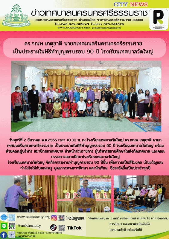 | วันศุกร์ที่ 2 ธันวาคม พ.ศ.2565 เวลา 10.30 น. ณ โรงเรียนเทศบาลวัดใหญ่ ดร.กณพ เกตุชาติ นายกเทศมนตรีนครนครศรีธรรมราช เป็นประธานในพิธีทำบุญครบรอบ 90 ปี โรงเรียนเทศบาลวัดใหญ่ พร้อมด้วยคณะผู้บริหาร สมาชิกสภาเทศบาล หัวหน้าส่วนราชการ ผู้บริหารสถานศึกษาในสังกัดเทศบาล และคณะกรรมการสถานศึกษาโรงเรียนเทศบาลวัดใหญ่ |