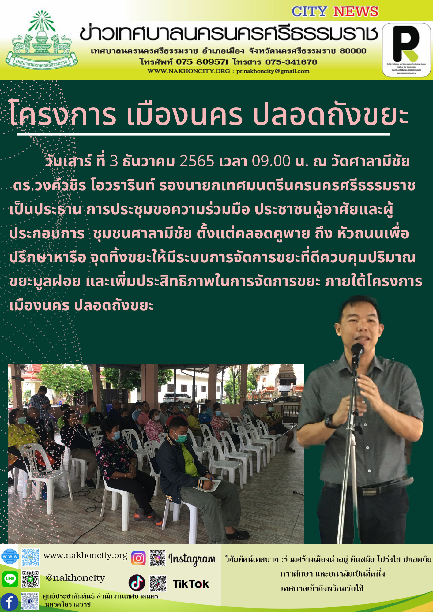| วันเสาร์ ที่ 3 ธันวาคม 2565 เวลา 09.00 น. ณ วัดศาลามีชัย ดร.วงค์วชิร โอวรารินท์ รองนายกเทศมนตรีนครนครศรีธรรมราช เป็นประธาน การประชุมขอความร่วมมือ ประชาชนผู้อาศัยและผู้ประกอบการ ชุมชนศาลามีชัย ตั้งแต่คลอดคูพาย ถึง หัวถนนเพื่อปรึกษาหารือ จุดทิ้งขยะให้มีระบบการจัดการขยะที่ดีควบคุมปริมาณขยะมูลฝอย และเพิ่มประสิทธิภาพในการจัดการขยะ ภายใต้โครงการ เมืองนคร ปลอดถังขยะ |