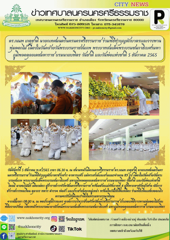 | ดร.กณพ เกตุชาติ นายกเทศมนตรีนครนครศรีธรรมราช ร่วมพิธีทำบุญตักบาตรและวางพานพุ่มดอกไม้ เนื่องในวันคล้ายวันพระบรมราชสมภพ พระบาทสมเด็จพระบรมชนกาธิเบศรมหาภูมิพลอดุลยเดชมหาราช บรมนาถบพิตร วันชาติ และวันพ่อแห่งชาติ 5 ธันวาคม 2565 |