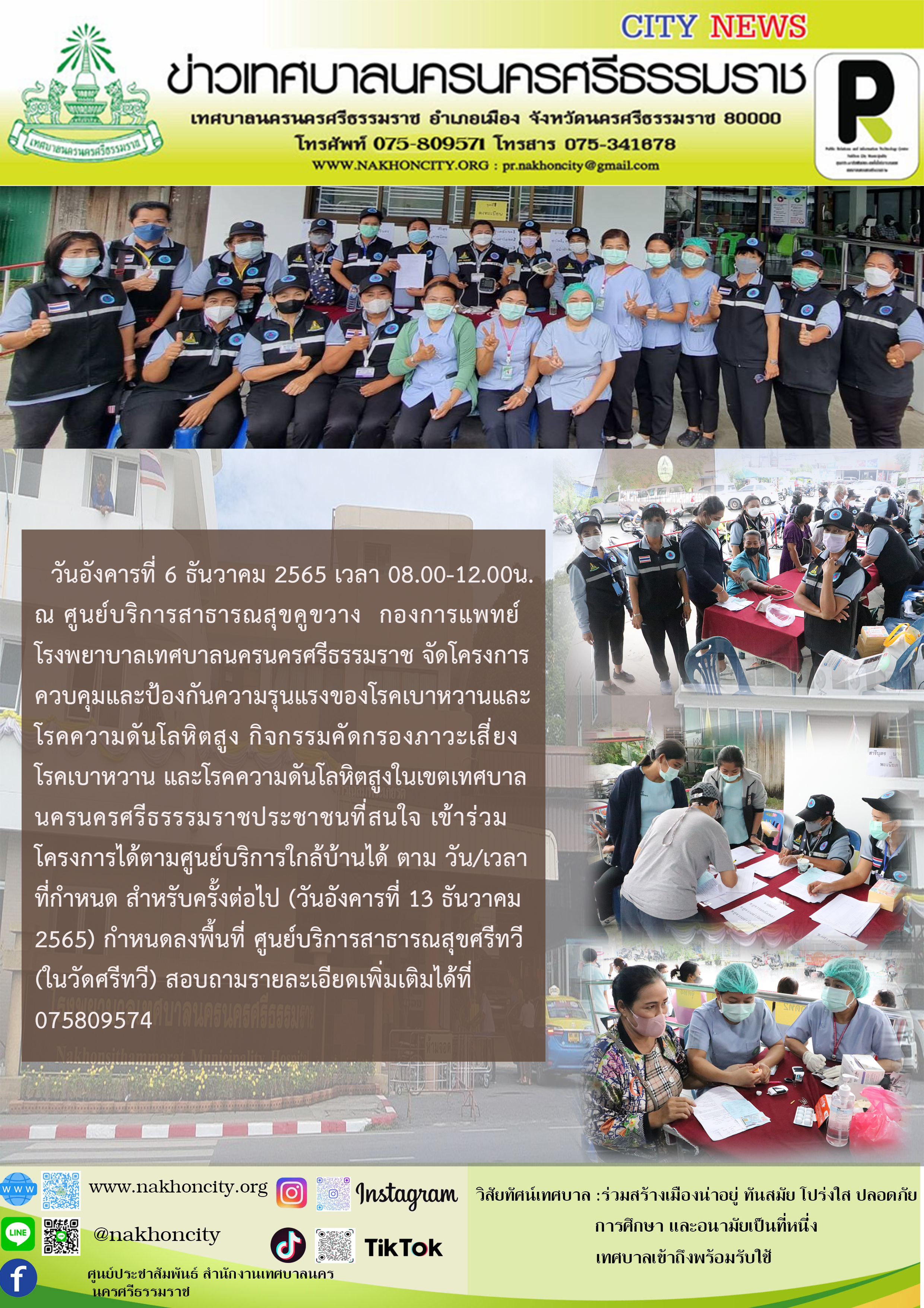 | โรงพยาบาลเทศบาลนครนครศรีธรรมราช จัดโครงการควบคุมและป้องกันความรุนแรงของโรคเบาหวานและโรคความดันโลหิตสูง กิจกรรมคัดกรองภาวะเสี่ยงโรคเบาหวานและโรคความดันโลหิตสูงในเขตเทศบาลนครนครศรีธรรรมราช |