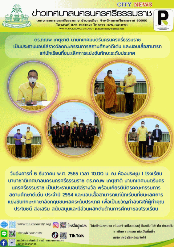 | ดร.กณพ เกตุชาติ นายกเทศมนตรีนครนครศรีธรรมราช เป็นประธานมอบโล่รางวัลคณะกรรมการสถานศึกษาดีเด่น และมอบเสื้อสามารถแก่นักเรียนที่ชนะเลิศการแข่งขันทักษะระดับประเทศ |