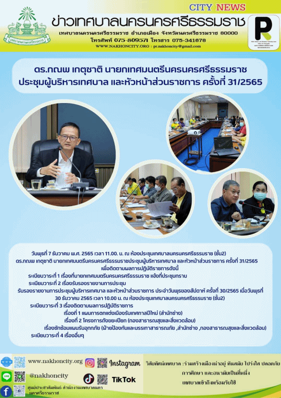 | ดร.กณพ เกตุชาติ นายกเทศมนตรีนครนครศรีธรรมราช ประชุมผู้บริหารเทศบาล และหัวหน้าส่วนราชการ ครั้งที่ 31/2565 |