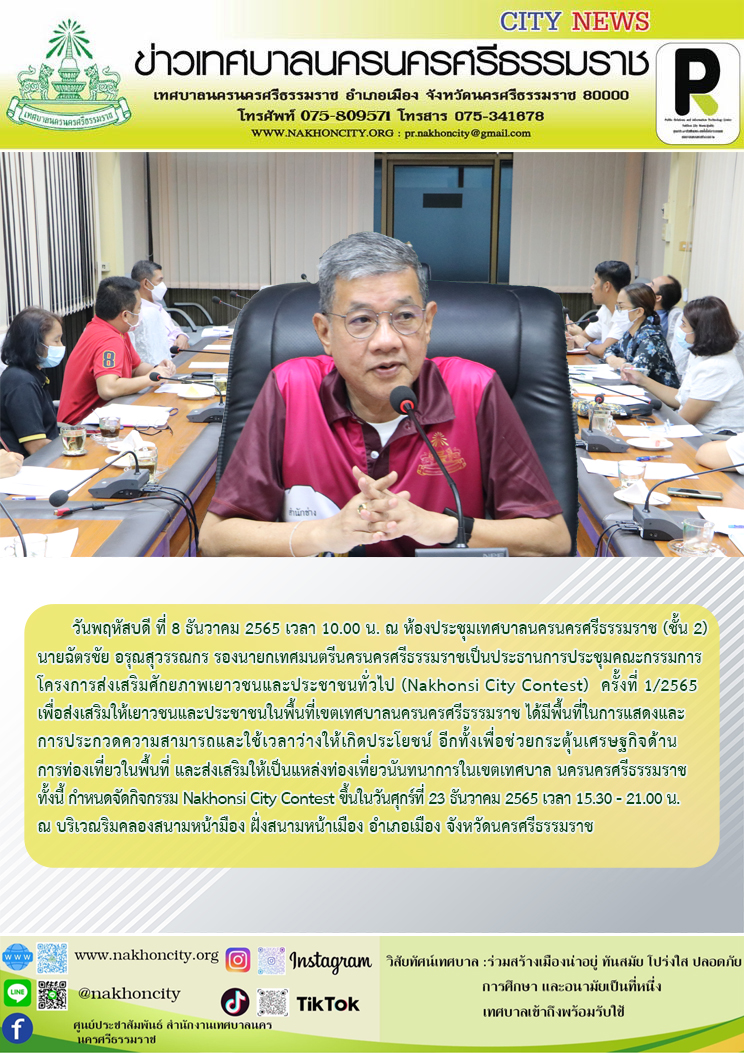 | วันพฤหัสบดี ที่ 8 ธันวาคม 2565 เวลา 10.00 น. ณ ห้องประชุมเทศบาลนครนครศรีธรรมราช (ชั้น 2) นายฉัตรชัย อรุณสุวรรณกร รองนายกเทศมนตรีนครนครศรีธรรมราช เป็นประธานการประชุมคณะกรรมการโครงการส่งเสริมศักยภาพเยาวชนและประชาชนทั่วไป (Nakhonsi City Contest) ครั้งที่ 1/2565 เพื่อส่งเสริมให้เยาวชนและประชาชนในพื้นที่เขตเทศบาลนครนครศรีธรรมราช ได้มีพื้นที่ในการแสดงและการประกวดความสามารถและใช้เวลาว่างให้เกิดประโยชน์ อีกทั้งเพื่อช่วยกระตุ้นเศรษฐกิจด้านการท่องเที่ยวในพื้นที่ และส่งเสริมให้เป็นแหล่งท่องเที่ยวนันทนาการในเขตเทศบาลนครนครศรีธรรมราช ทั้งนี้ กำหนด จัด กิจกรรม Nakhonsi City Contest ขึ้น ในวันศุกร์ที่ 23 ธันวาคม 2565 เวลา 15.30 - 21.00 น. ณ บริเวณริมคลองสนามหน้ามือง ฝั่งสนามหน้าเมือง อำเภอเมือง จังหวัดนครศรีธรรมราช