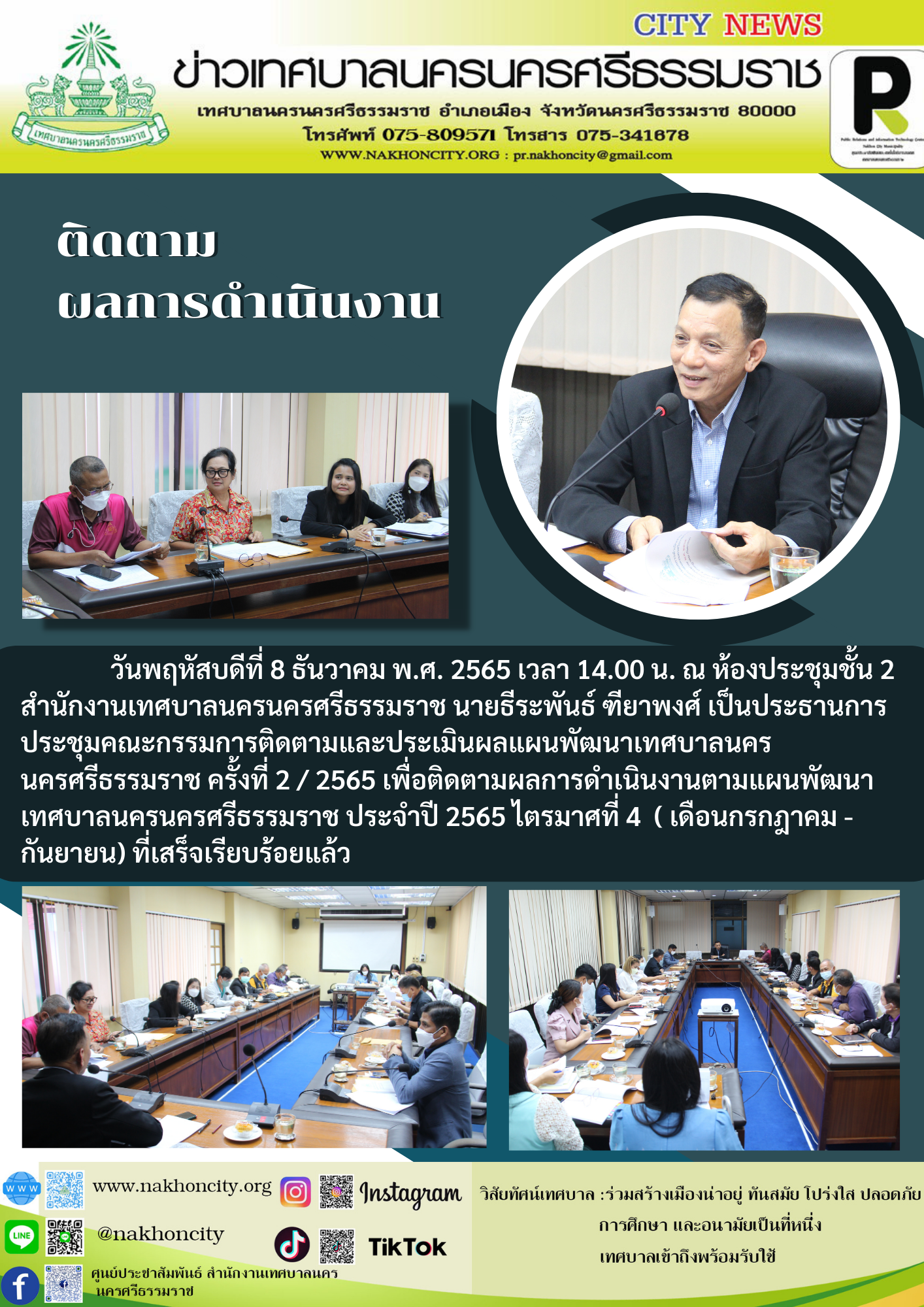 | วันพฤหัสบดีที่ 8 ธันวาคม พ.ศ. 2565 เวลา 14.00 น. ณ ห้องประชุมชั้น 2 สำนักงานเทศบาลนครนครศรีธรรมราช นายธีระพันธ์ ฑียาพงศ์ เป็นประธานการประชุมคณะกรรมการติดตามและประเมินผลแผนพัฒนาเทศบาลนครนครศรีธรรมราช ครั้งที่ 2 / 2565 เพื่อติดตามผลการดำเนินงานตามแผนพัฒนาเทศบาลนครนครศรีธรรมราช ประจำปี 2565 ไตรมาศที่ 4 ( เดือนกรกฎาคม - กันยายน) ที่เสร็จเรียบร้อยแล้ว