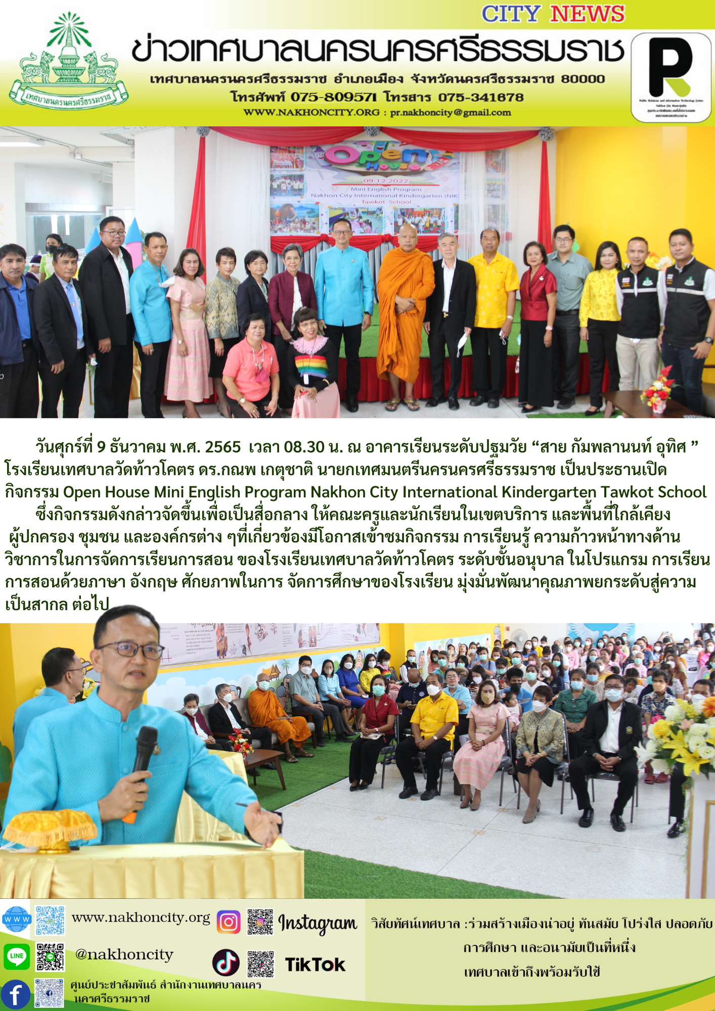 | วันศุกร์ที่ 9 ธันวาคม พ.ศ. 2565 เวลา 08.30 น. ณ อาคารเรียนระดับปฐมวัย “สาย กัมพลานนท์ อุทิศ ” โรงเรียนเทศบาลวัดท้าวโคตร ดร.กณพ เกตุชาติ นายกเทศมนตรีนครนครศรีธรรมราช เป็นประธานเปิด กิจกรรม Open House Mini English Program Nakhon City International Kindergarten Tawkot School ซึ่งกิจกรรมดังกล่าวจัดขึ้นเพื่อเป็นสื่อกลาง ให้คณะครูและนักเรียนในเขตบริการ และพื้นที่ใกล้เคียง ผู้ปกครอง ชุมชน และองค์กรต่าง ๆที่เกี่ยวข้องมีโอกาสเข้าชมกิจกรรม การเรียนรู้ ความก้าวหน้าทางด้านวิชาการในการจัดการเรียนการสอน ของโรงเรียนเทศบาลวัดท้าวโคตร ระดับชั้นอนุบาล ในโปรแกรม การเรียนการสอนด้วยภาษา อังกฤษ ศักยภาพในการ จัดการศึกษาของโรงเรียน มุ่งมั่นพัฒนาคุณภาพยกระดับสู่ความเป็นสากล ต่อไป