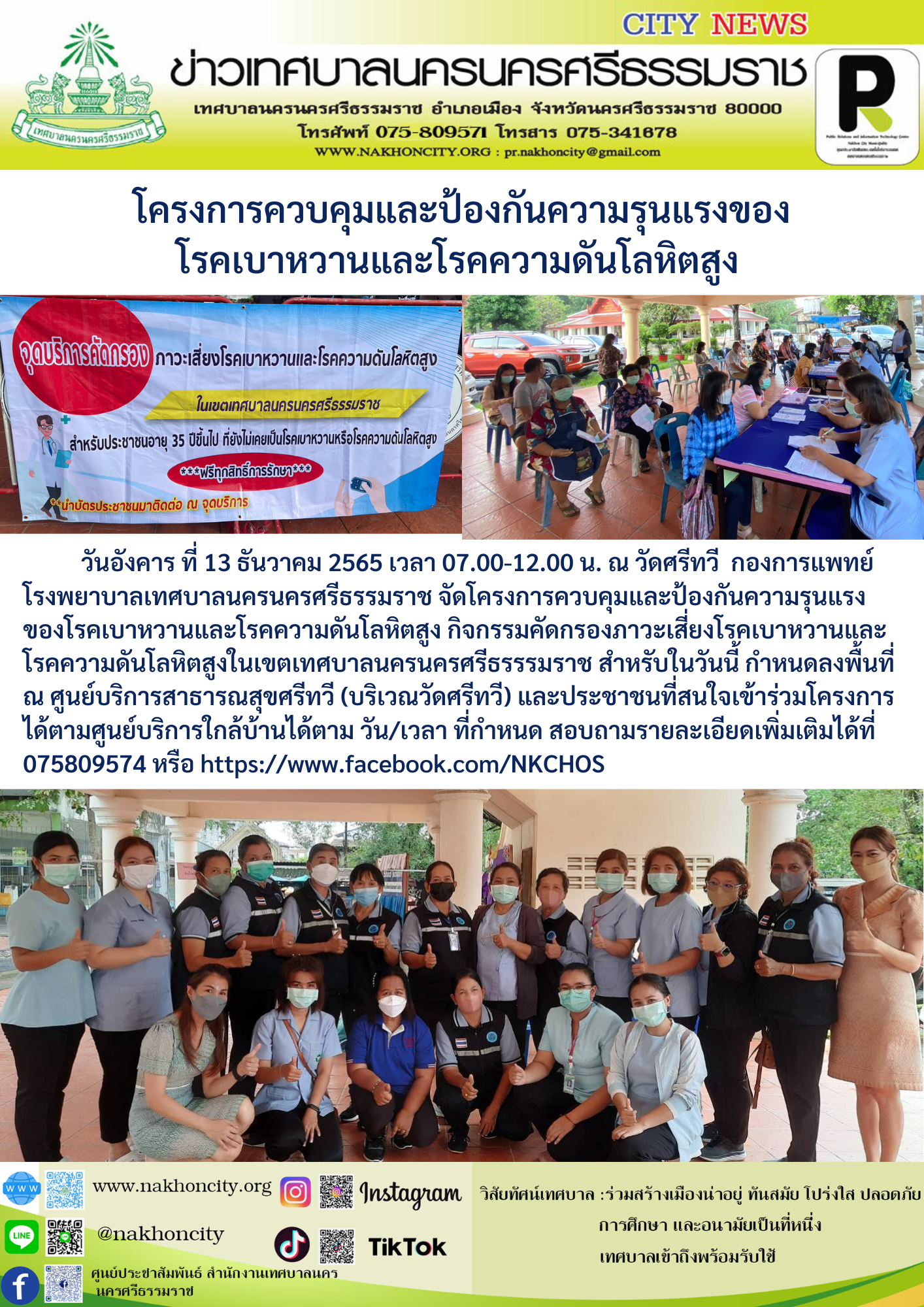 | กองการแพทย์ โรงพยาบาลเทศบาลนครนครศรีธรรมราช จัดโครงการควบคุมและป้องกันความรุนแรงของโรคเบาหวานและโรคความดันโลหิตสูง กิจกรรมคัดกรองภาวะเสี่ยงโรคเบาหวานและโรคความดันโลหิตสูงในเขตเทศบาลนครนครศรีธรรรมราช
