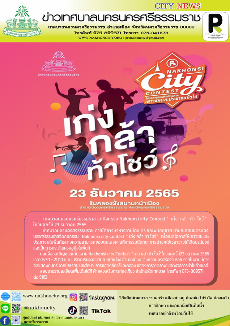 | เทศบาลนครนครศรีธรรมราชจัดกิจกรรม Nakhonsi city Contest “ เก่ง กล้า ท้า โชว์” ในวันศุกร์ ที่ 23 ธันวาคม 2565 |