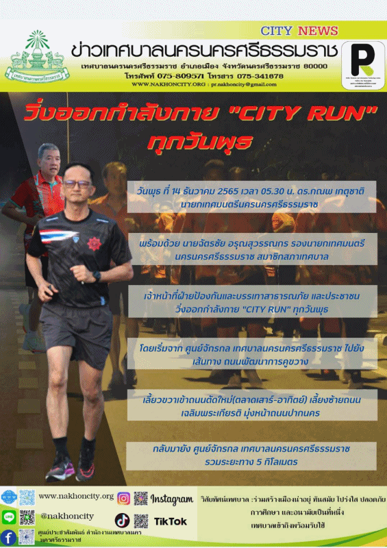 | ดร.กณพ เกตุชาติ นายกเทศมนตรีนครนครศรีธรรมราช พร้อมด้วยคณะผู้บริหาร สมาชิกสภาเทศบาล เจ้าหน้าที่ฝ่ายป้องกันและบรรเทาสาธารณภัย ประชาชนทั่วไป วิ่งออกกำลังกาย "CITY RUN" ทุกวันพุธ |