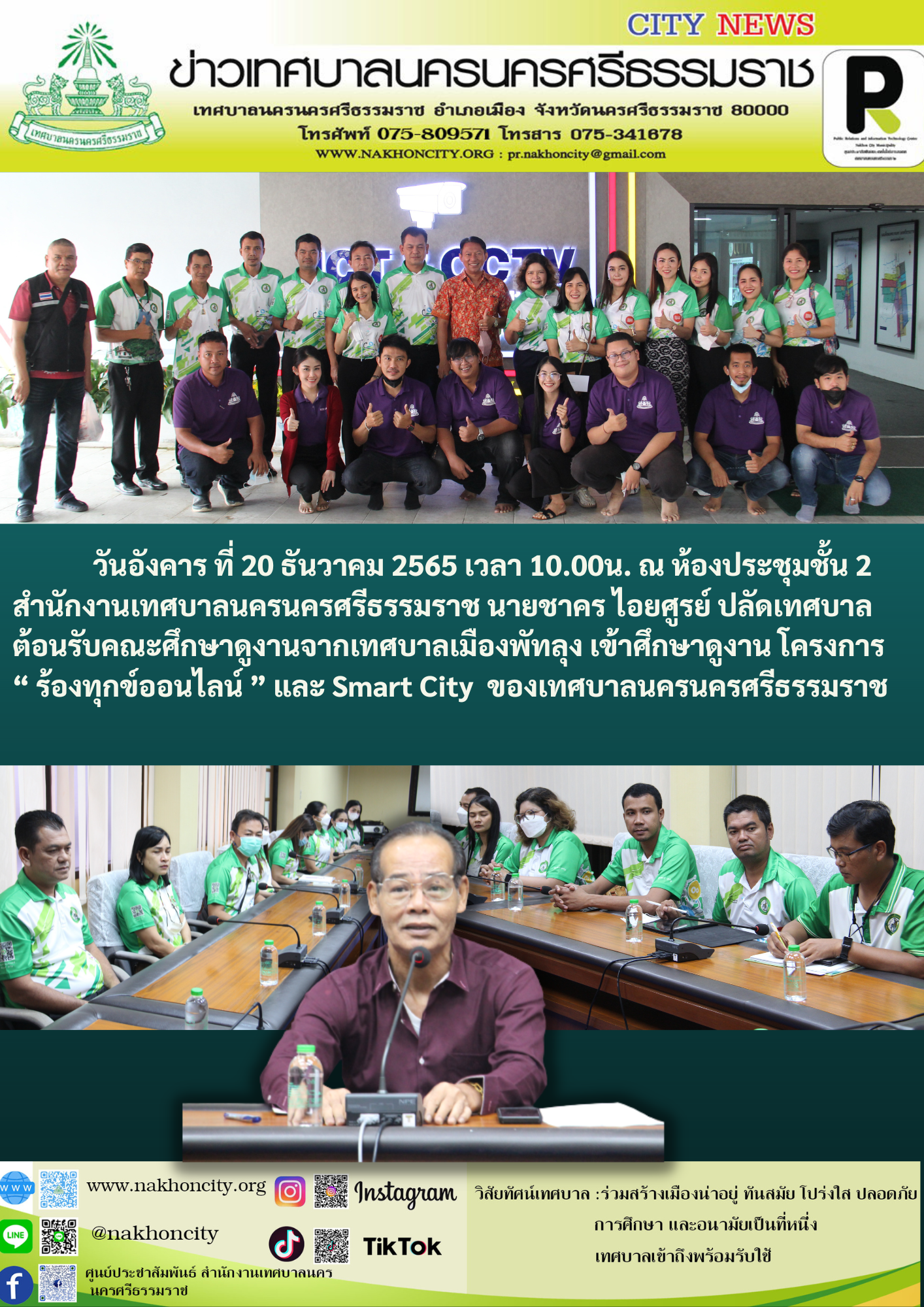 | วันจันทร์ ที่ 20 ธันวาคม 2565 เวลา 10.00น. ณ ห้องประชุมชั้น 2 สำนักงานเทศบาลนครนครศรีธรรมราช นายชาคร ไอยศูรย์ ปลัดเทศบาล ต้อนรับคณะศึกษาดูงานจากเทศบาลเมืองพัทลุง เข้าศึกษาดูงาน โครงการ “ ร้องทุกข์ออนไลน์ ” และ Smart City ของเทศบาลนครนครศรีธรรมราช |