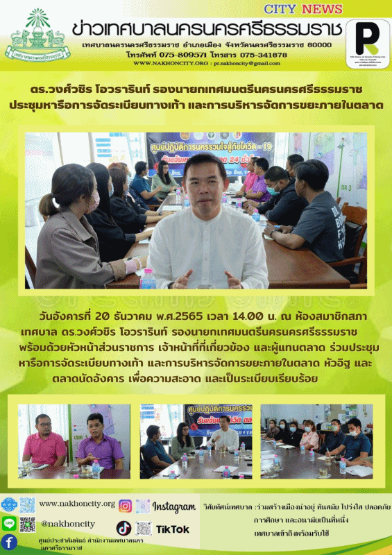 | ดร.วงศ์วชิร โอวรารินท์ รองนายกเทศมนตรีนครนครศรีธรรมราช ประชุมหารือการจัดระเบียบทางเท้า และการบริหารจัดการขยะภายในตลาด |