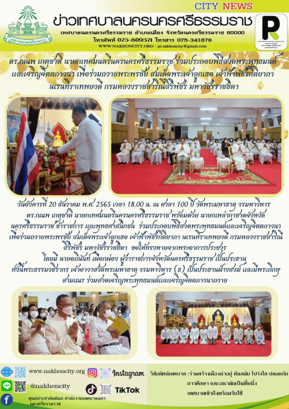 | ดร.กณพ เกตุชาติ นายกเทศมนตรีนครนครศรีธรรมราช ร่วมประกอบพิธีสวดพระพุทธมนต์และเจริญจิตตภาวนา เพื่อร่วมถวายพระพรชัย สมเด็จพระเจ้าลูกเธอ เจ้าฟ้าพัชรกิติยาภา นเรนทิราเทพยวดี กรมหลวงราชสาริณีสิริพัชร มหาวัชรราชธิดา |