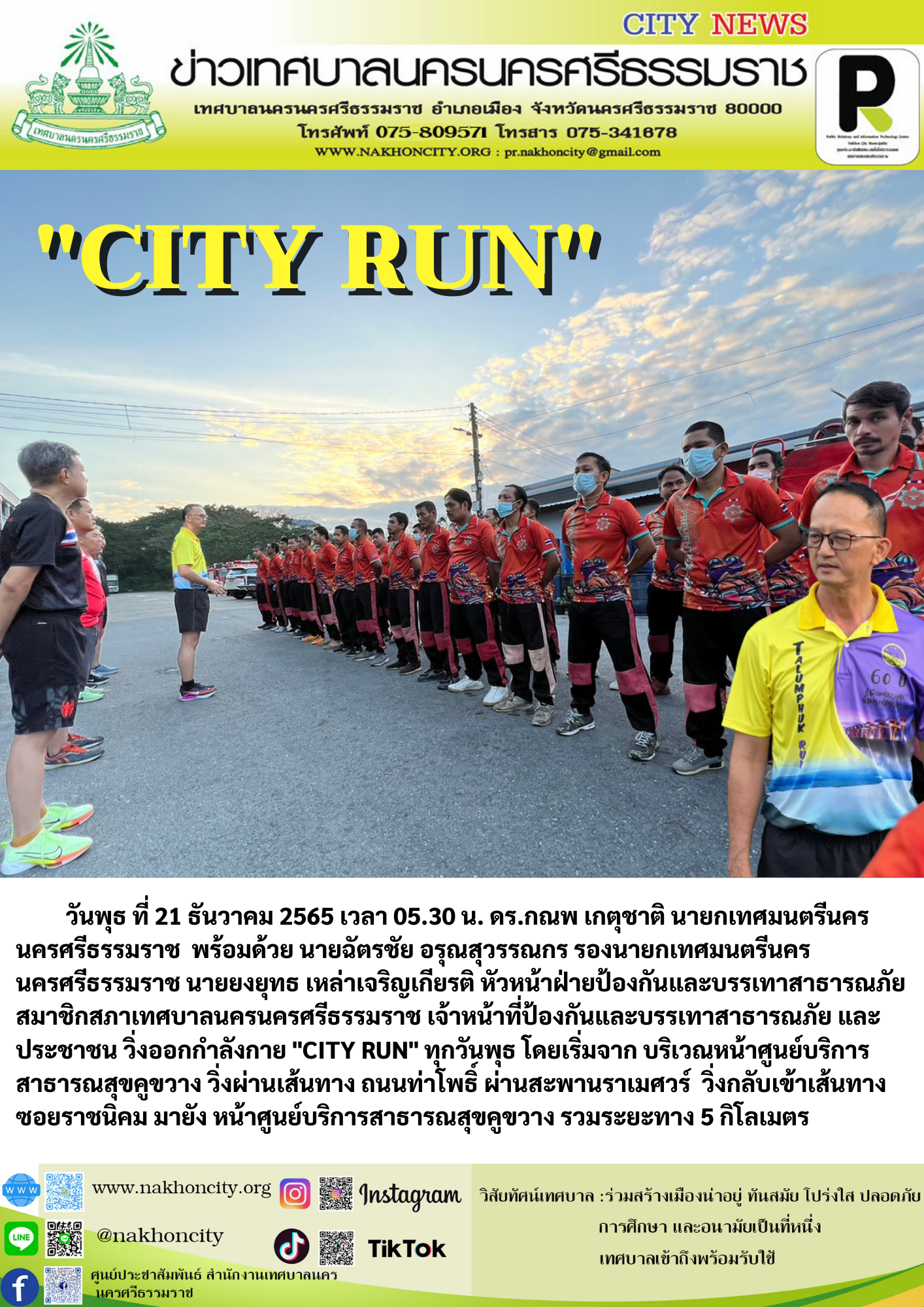 | วันพุธ ที่ 21 ธันวาคม 2565 เวลา 05.30 น. ดร.กณพ เกตุชาติ นายกเทศมนตรีนครนครศรีธรรมราช พร้อมด้วย นายฉัตรชัย อรุณสุวรรณกร รองนายกเทศมนตรีนครนครศรีธรรมราช นายยงยุทธ เหล่าเจริญเกียรติ หัวหน้าฝ่ายป้องกันและบรรเทาสาธารณภัย สมาชิกสภาเทศบาลนครนครศรีธรรมราช เจ้าหน้าที่ป้องกันและบรรเทาสาธารณภัย และประชาชน วิ่งออกกำลังกาย "CITY RUN" ทุกวันพุธ โดยเริ่มจาก บริเวณหน้าศูนย์บริการสาธารณสุขคูขวาง วิ่งผ่านเส้นทาง ถนนท่าโพธิ์ ผ่านสะพานราเมศวร์ วิ่งกลับเข้าเส้นทางซอยราชนิคม มายัง หน้าศูนย์บริการสาธารณสุขคูขวาง รวมระยะทาง 5 กิโลเมตร |