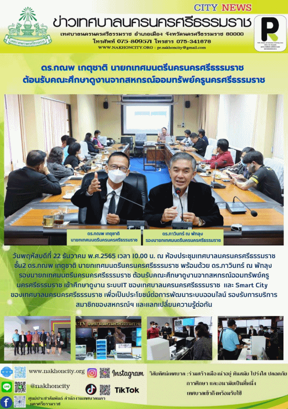 | วันพฤหัสบดีที่ 22 ธันวาคม พ.ศ.2565 เวลา 10.00 น. ณ ห้องประชุมเทศบาลนครนครศรีธรรมราช ชั้น2 ดร.กณพ เกตุชาติ นายกเทศมนตรีนครนครศรีธรรมราช พร้อมด้วย ดร.ภาวินทร์ ณ พัทลุง รองนายกเทศมนตรีนครนครศรีธรรมราช ต้อนรับคณะศึกษาดูงานจากสหกรณ์ออมทรัพย์ครูนครศรีธรรมราช เข้าศึกษาดูงาน ระบบIT ของเทศบาลนครนครศรีธรรมราช และ Smart City ของเทศบาลนครนครศรีธรรมราช เพื่อเป็นประโยชน์ต่อการพัฒนาระบบออนไลน์ รองรับการบริการสมาชิกของสหกรณ์ฯ และแลกเปลี่ยนความรู้ต่อกัน ................. ภาพ//ข่าว//จันทร์จิรา ตรวจทาน//ฐิตินันท์ |