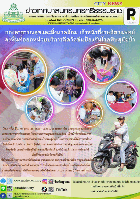 | วันเสาร์ที่24 ธันวาคม 2565 เวลา 09.30 -11.30 น. ณ ชุมชนท่าช้าง และชุมชนลูกแม่อ่างทอง เทศบาลนครนครศรีธรรมราช โดยกองสาธารณสุขและสิ่งแวดล้อม เจ้าหน้าที่งานสัตวแพทย์ ลงพื้นที่ออกหน่วยบริการฉีดวัคซีนป้องกันโรคพิษสุนัขบ้า ให้แก่ประชาชนที่ให้ความสนใจนำสัตว์เลี้ยงเข้ารับบริการ เพื่อกระตุ้นให้ประชาชนตระหนักถึงความสำคัญและอันตรายของโรคพิษสุนัขบ้า เพราะโรคพิษสุนัขบ้าสามารถป้องกันได้ แต่ถ้าป่วยแล้วไม่สามารถรักษาได้ เสียชีวิตทุกรายไม่ว่าคนหรือสัตว์ ซึ่งในวันนี้มีประชาชนทยอยนำสัตว์เลี้ยง สุนัขและแมว มาลงทะเบียนแจ้งชื่อ อายุของสัตว์เลี้ยงรับบริการฉีดวัคซีนป้องกันโรคพิษสุนัขบ้า รับใบรับรองและป้ายโลหะไปคล้องคอสัตว์เลี้ยง สามารถติดต่อสอบถามได้ที่สถานพยาบาลสัตว์ทุ่งท่าลาด โทร.075 358292 ( วัน-เวลาราชการ ) ................... ภาพ//ข่าว//จันทร์จิรา |