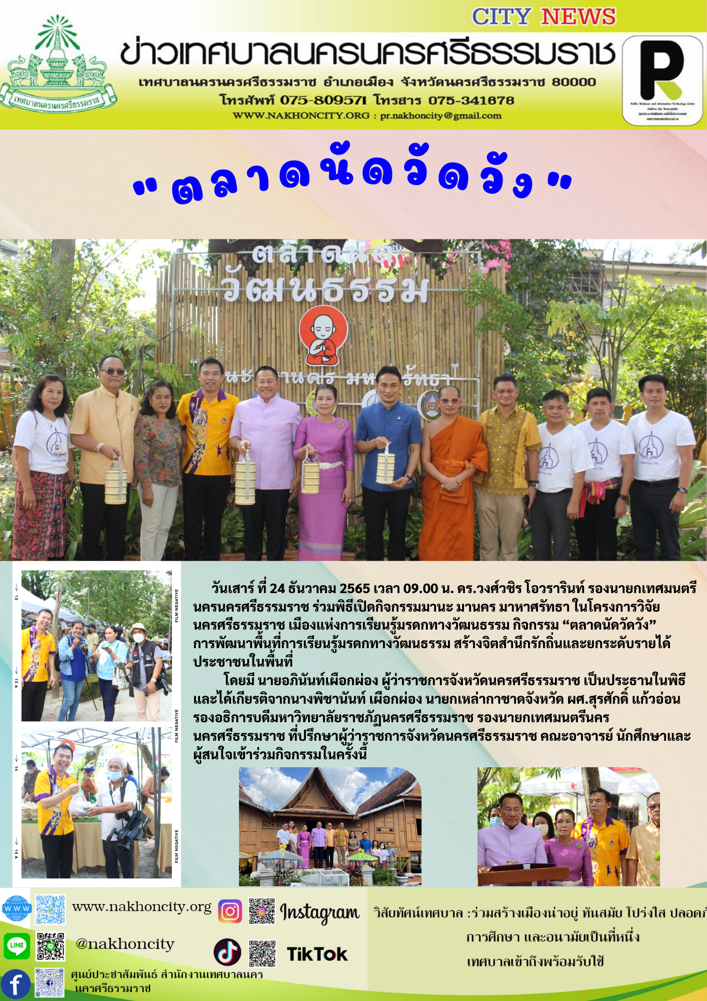 วันเสาร์ ที่ 24 ธันวาคม 2565 เวลา 09.00 น. ดร.วงศ์วชิร โอวรารินท์ รองนายกเทศมนตรีนครนครศรีธรรมราช ร่วมพิธีเปิดกิจกรรม มานะ มานคร มาหาศรัทธา ในโครงการวิจัยนครศรีธรรมราช เมืองแห่งการเรียนรู้มรดกทางวัฒนธรรม กิจกรรม “ตลาดนัดวัดวัง” การพัฒนาพื้นที่การเรียนรู้มรดกทางวัฒนธรรม สร้างจิตสำนึกรักถิ่นและยกระดับรายได้ประชาชนในพื้นที่ โดยมี นายอภินันท์ เผือกผ่อง ผู้ว่าราชการจังหวัดนครศรีธรรมราช เป็นประธานในพิธี และได้เกียรติจากนางพิชานันท์ เผือกผ่อง นายกเหล่ากาชาดจังหวัด ผศ.สุรศักดิ์ แก้วอ่อน รองอธิการบดีมหาวิทยาลัยราชภัฏนครศรีธรรมราช รองนายกเทศมนตรีนครนครศรีธรรมราช ที่ปรึกษาผู้ว่าราชการจังหวัดนครศรีธรรมราช คณะอาจารย์ นักศึกษาและผู้สนใจเข้าร่วมกิจกรรมในครั้งนี้ |