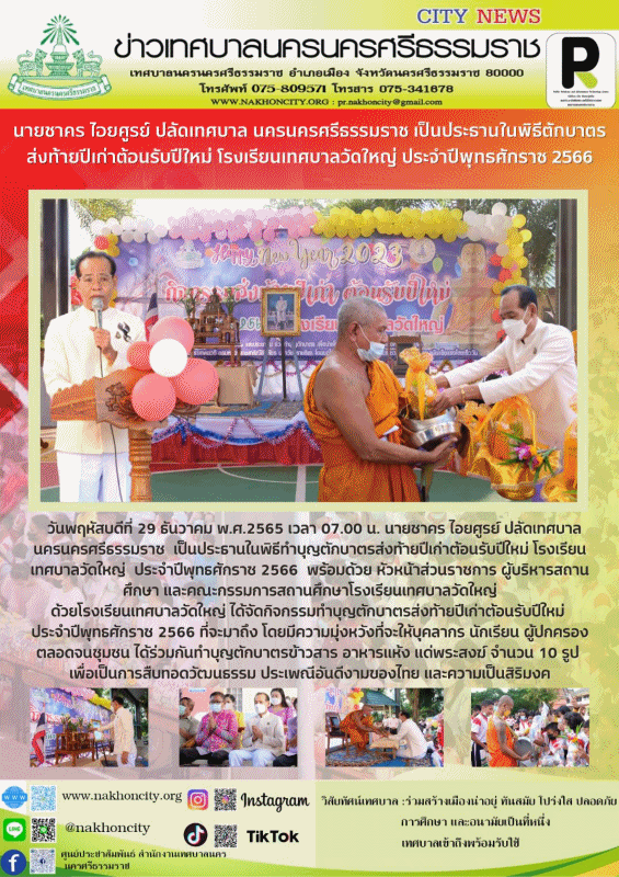 | นายชาคร ไอยศูรย์ ปลัดเทศบาล นครนครศรีธรรมราช เป็นประธานในพิธีตักบาตรส่งท้ายปีเก่าต้อนรับปีใหม่ โรงเรียนเทศบาลวัดใหญ่ ประจำปีพุทธศักราช 2566 |
