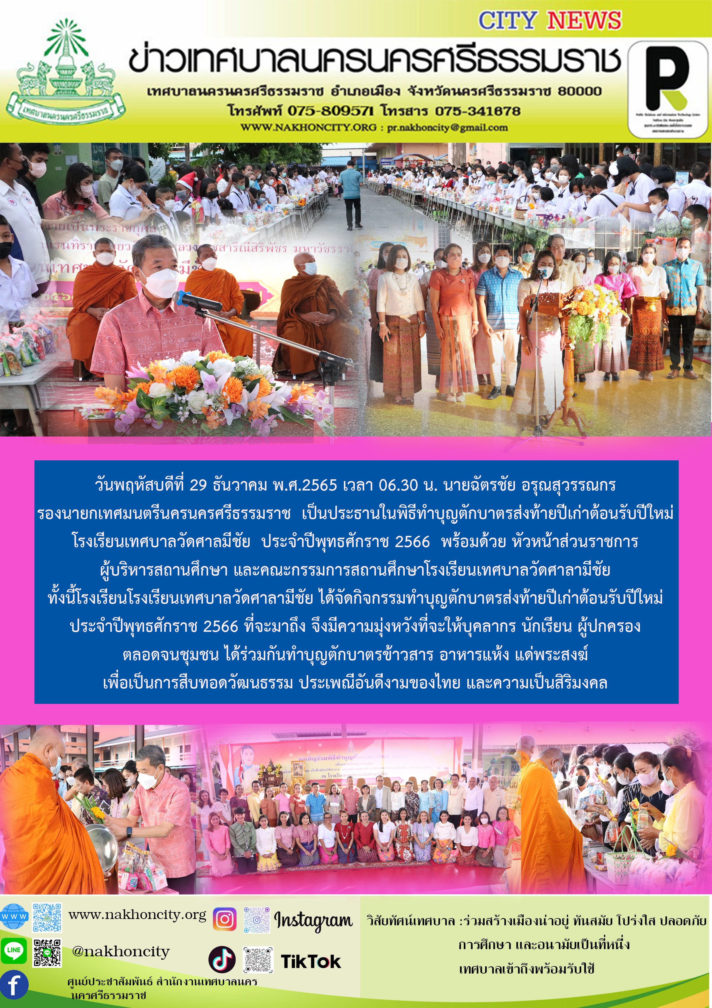 | นายฉัตรชัย อรุณสุวรรณกร รองนายกเทศมนตรีนครนครศรีธรรมราช เป็นประธานในพิธีตักบาตรส่งท้ายปีเก่าต้อนรับปีใหม่ โรงเรียนเทศบาลวัดศาลามีชัย ประจำปีพุทธศักราช 2566 |