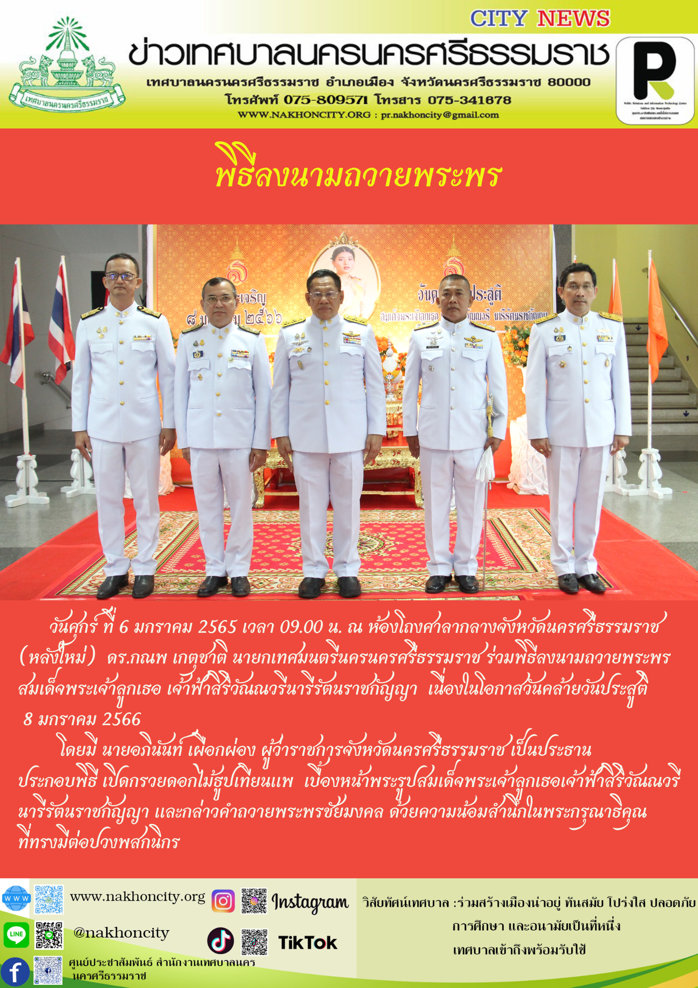 | ดร.กณพ เกตุชาติ นายกเทศมนตรีนครนครศรีธรรมราช ร่วมพิธีลงนามถวายพระพร สมเด็จพระเจ้าลูกเธอ เจ้าฟ้าสิริวัณณวรีนารีรัตนราชกัญญา เนื่องในโอกาสวันคล้ายวันประสูติ 8 มกราคม 2566 |