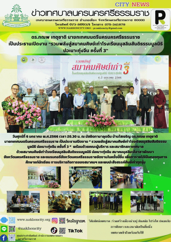 | วันศุกร์ที่ 6 มกราคม พ.ศ.2566 เวลา 20.30 น. ณ มัสยิดกามาลุดดีน บ้านไสเจริญ ดร.กณพ เกตุชาติ นายกเทศมนตรีนครนครศรีธรรมราช เป็นประธานเปิดงาน “ รวมพลังสู่สมาคมศิษย์เก่าโรงเรียนมุสลิมสันติธรรมมูลนิธิ ปอเนาะทุ่งจีน ครั้งที่ 3 ” พร้อมด้วยคณะผู้บริหาร และสมาชิกสภาเทศบาล ด้วยสมาคมศิษย์เก่าโรงเรียนมุสลิมสันติธรรมมูลนิธิ ปอเนาะทุ่งจีน สมาคมมุสลีมะฮ์อาสาพัฒนา จังหวัดนครศรีธรรมราช และชมรมกอรีจังหวัดนครศรีธรรมราช จัดงานในครั้งนี้ขึ้น เพื่อหารายได้เป็นกองทุนการศึกษาแก่นักเรียน การบริหารกิจการของสมาคมฯ และพบปะสังสรรค์ศิษย์เก่าทุกรุ่น ............... ภาพ//ข่าว//จันทร์จิรา
