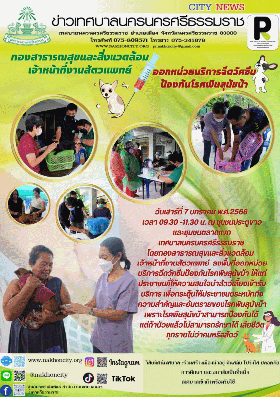 | วันเสาร์ที่ 7 มกราคม พ.ศ.2566 เวลา 09.30 -11.30 น. ณ ชุมชนประตูขาว และชุมชนตลาดแขก เทศบาลนครนครศรีธรรมราช โดยกองสาธารณสุขและสิ่งแวดล้อม เจ้าหน้าที่งานสัตวแพทย์ ลงพื้นที่ออกหน่วยบริการฉีดวัคซีนป้องกันโรคพิษสุนัขบ้า ให้แก่ประชาชนที่ให้ความสนใจนำสัตว์เลี้ยงเข้ารับบริการ เพื่อกระตุ้นให้ประชาชนตระหนักถึงความสำคัญและอันตรายของโรคพิษสุนัขบ้า เพราะโรคพิษสุนัขบ้าสามารถป้องกันได้ แต่ถ้าป่วยแล้วไม่สามารถรักษาได้ เสียชีวิตทุกรายไม่ว่าคนหรือสัตว์ ซึ่งในวันนี้มีประชาชนทยอยนำสัตว์เลี้ยง สุนัขและแมว มาลงทะเบียนแจ้งชื่อ อายุของสัตว์เลี้ยงรับบริการฉีดวัคซีนป้องกันโรคพิษสุนัขบ้า รับใบรับรองและป้ายโลหะไปคล้องคอสัตว์เลี้ยง สามารถติดต่อสอบถามได้ที่สถานพยาบาลสัตว์ทุ่งท่าลาด โทร.075 358292 ( วัน-เวลาราชการ ) ................... ภาพ//ข่าว//จันทร์จิรา |