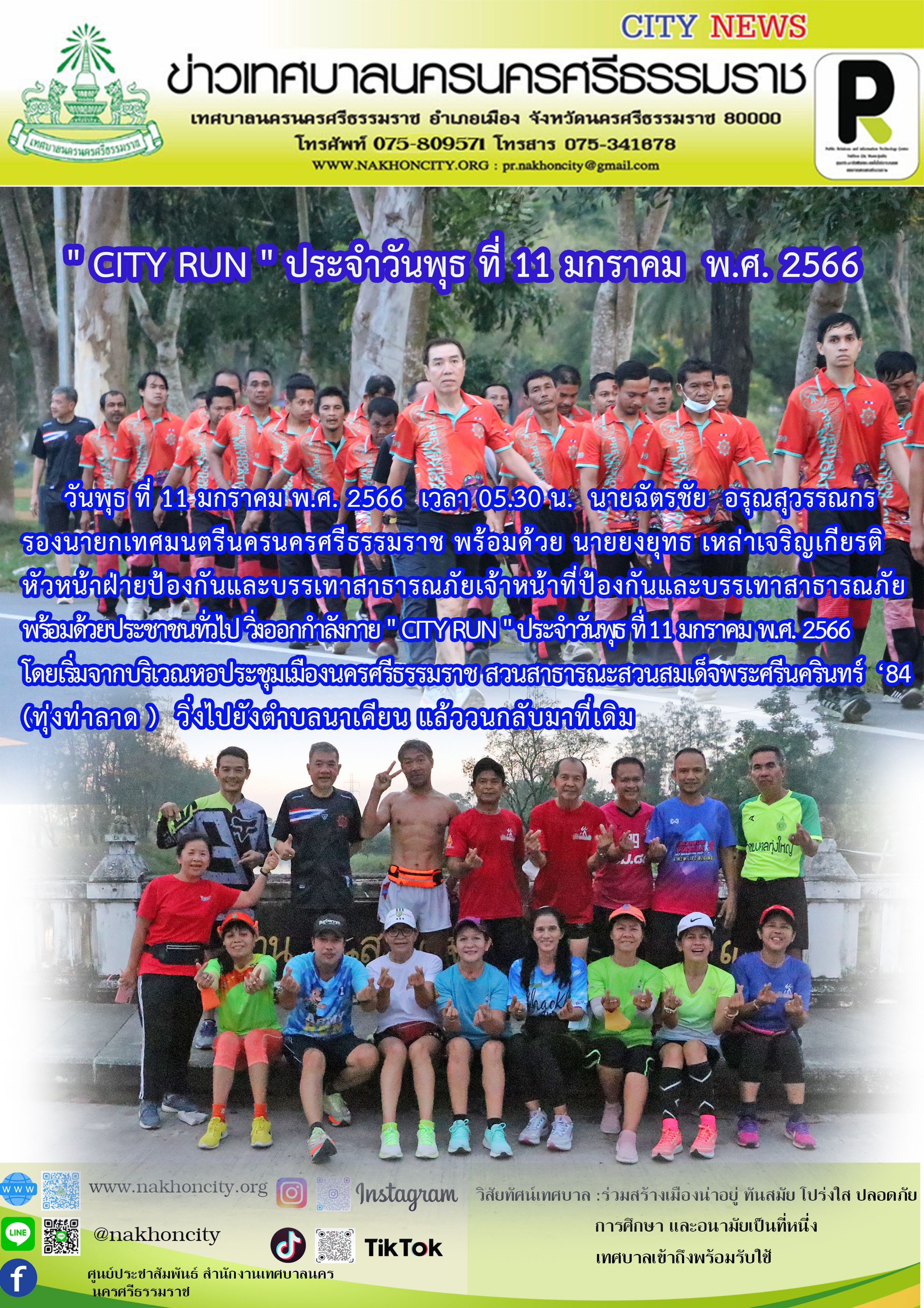 | วันพุธที่ 11 มกราคม พ.ศ. 2566 เวลา 05.30 น. นายฉัตรชัย อรุณสุวรรณกร รองนายกเทศมนตรีนครนครศรีธรรมราช พร้อมด้วย นายยงยุทธ เหล่าเจริญเกียรติ หัวหน้าฝ่ายป้องกันและบรรเทาสาธารณภัย เจ้าหน้าที่ป้องกันและบรรเทาสาธารณภัย พร้อมด้วยประชาชนทั่วไป วิ่งออกกำลังกาย " CITY RUN " ประจำวันพุธที่ 11 มกราคม พ.ศ. 2566 โดยเริ่มจากบริเวณหอประชุมเมืองนครศรีธรรมราช สวนสาธารณะสวนสมเด็จพระศรีนครินทร์ ‘84 (ทุ่งท่าลาด ) วิ่งไปยังตำบลนาเคียน แล้ววนกลับมาที่เดิม