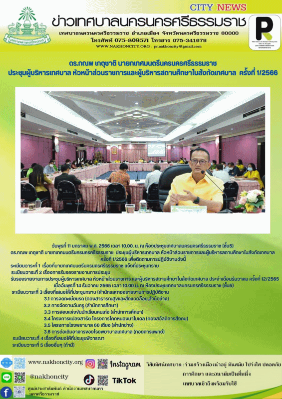 | ดร.กณพ เกตุชาติ นายกเทศมนตรีนครนครศรีธรรมราช ประชุมผู้บริหารเทศบาล หัวหน้าส่วนราชการและผู้บริหารสถานศึกษาในสังกัดเทศบาล ครั้งที่ 1/2566 |