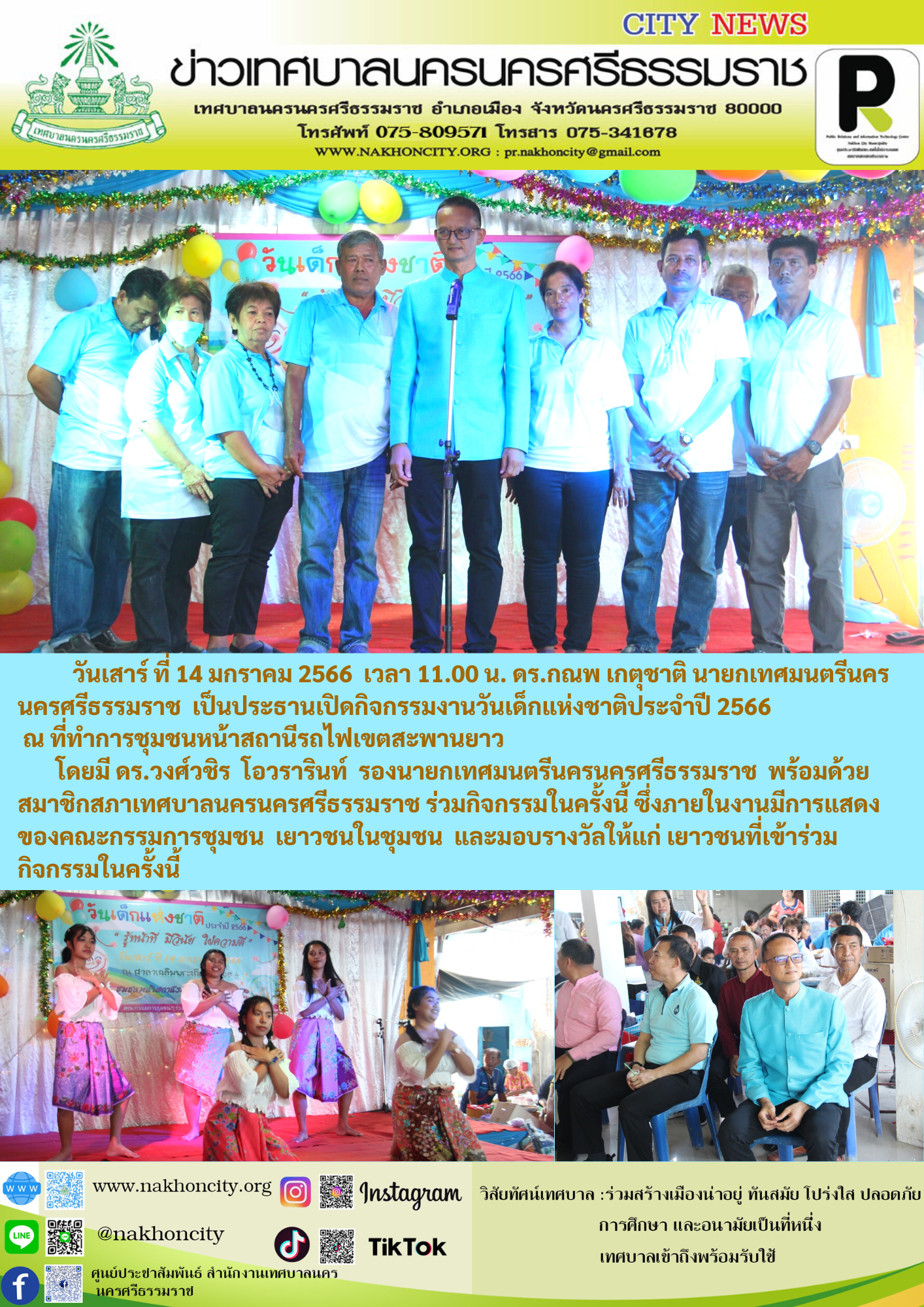 | ดร.กณพ เกตุชาติ นายกเทศมนตรีนครนครศรีธรรมราช เป็นประธานเปิดกิจกรรมงานวันเด็กแห่งชาติประจำปี 2566 ณ ที่ทำการชุมชนหน้าสถานีรถไฟเขตสะพานยาว |