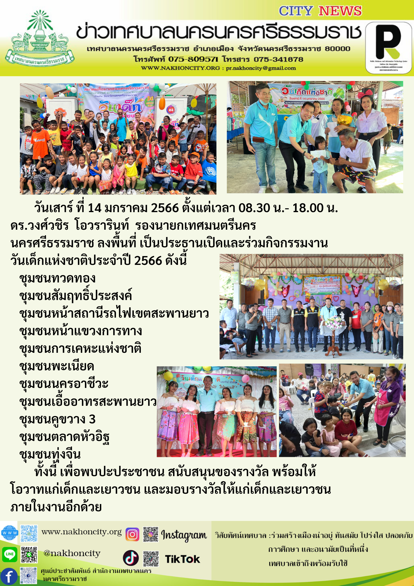 | ดร.วงศ์วชิร โอวรารินท์ รองนายกเทศมนตรีนครนครศรีธรรมราช ลงพื้นที่ เป็นประธานเปิดและร่วมกิจกรรมงานวันเด็กแห่งชาติประจำปี 2566 |